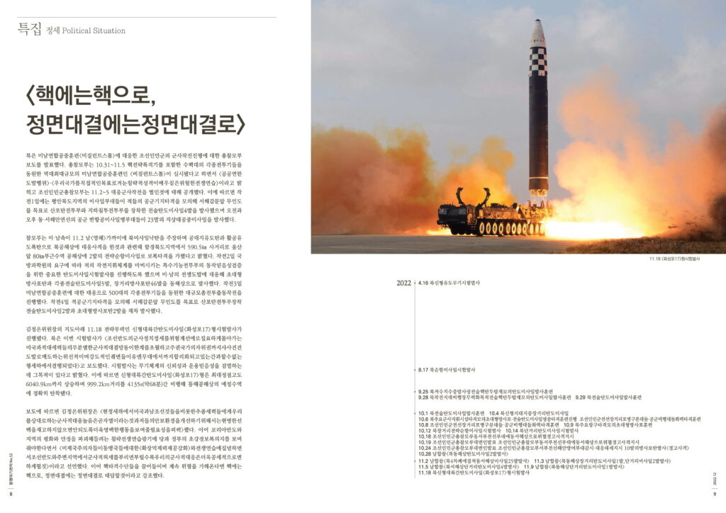 김정은위원장의 지도아래 11.18 전략무력인 신형대륙간탄도미사일<화성포17>형시험발사가 진행됐다. 북은 이번 시험발사가 <조선반도의군사정치정세를위험계선에로집요하게몰아가는미국과적대세력들의무분별한군사적대결망동이한계를초월하고주권국가의자위권까지사사건건도발로매도하는위선적이며강도적인궤변들이유엔무대에서까지합리화되고있는간과할수없는형세하에서결행되었다>고 보도했다. 시험발사는 무기체계의 신뢰성과 운용믿음성을 검열하는데 그목적이 있다고 밝혔다. 이에 따르면 신형대륙간탄도미사일<화성포17>형은 최대정점고도 6040.9km까지 상승하며 999.2km거리를 4135s(약68분)간 비행해 동해공해상의 예정수역에 정확히 탄착됐다.
