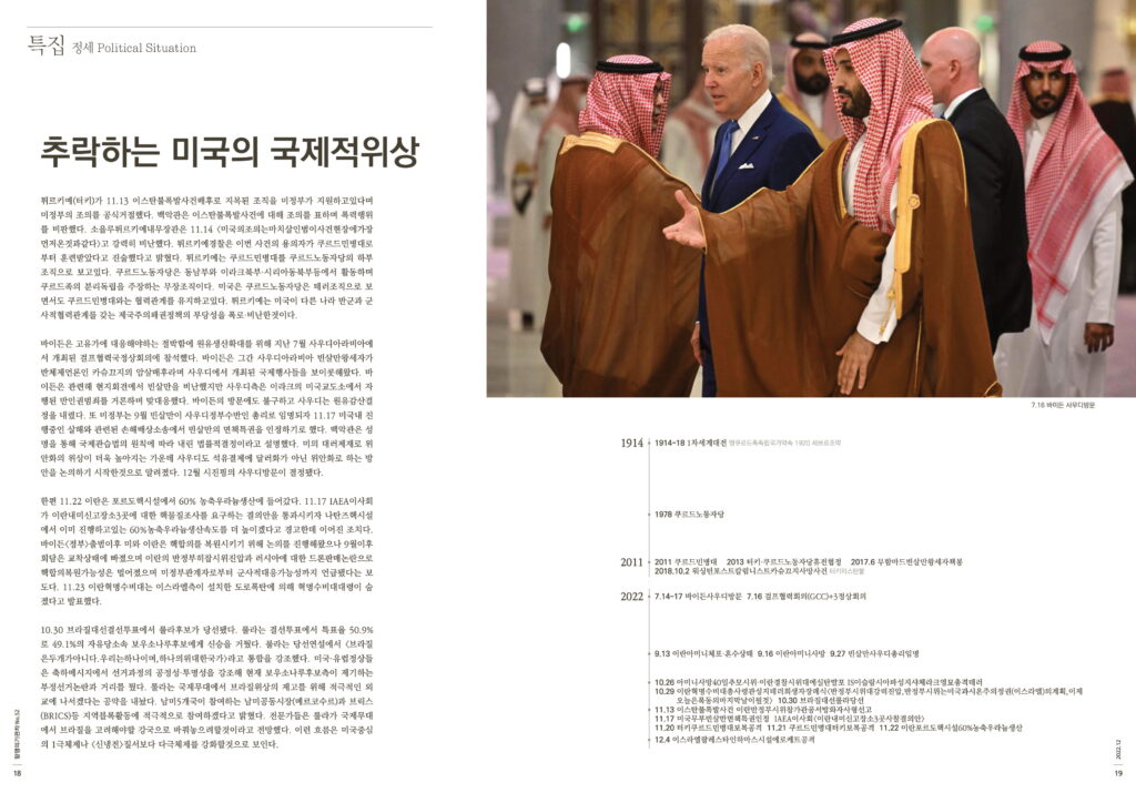 바이든은 고유가에 대응해야하는 절박함에 원유생산확대를 위해 지난 7월 사우디아라비아에서 개최된 걸프협력국정상회의에 참석했다. 바이든은 그간 사우디아라비아 빈살만왕세자가 반체제언론인 카슈끄지의 암살배후라며 사우디에서 개최된 국제행사들을 보이콧해왔다. 바이든은 관련해 현지회견에서 빈살만을 비난했지만 사우디측은 이라크의 미국교도소에서 자행된 반인권범죄를 거론하며 맞대응했다. 바이든의 방문에도 불구하고 사우디는 원유감산결정을 내렸다. 또 미정부는 9월 빈살만이 사우디정부수반인 총리로 임명되자 11.17 미국내 진행중인 살해와 관련된 손해배상소송에서 빈살만의 면책특권을 인정하기로 했다. 백악관은 성명을 통해 국제관습법의 원칙에 따라 내린 법률적결정이라고 설명했다. 미의 대러제재로 위안화의 위상이 더욱 높아지는 가운데 사우디도 석유결제에 달러화가 아닌 위안화로 하는 방안을 논의하기 시작한것으로 알려졌다. 12월 시진핑의 사우디방문이 결정됐다.
