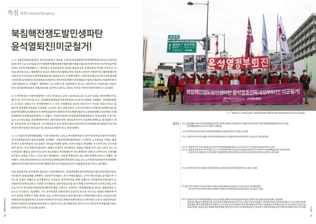 11.5 반미투본은 미대사관앞에서 <THE WORLD ANTI-IMPERIALIST PLATFORM>·<핵전쟁화근미군철거!>등 이미지피시를 들고 <북침핵전쟁책동윤석열정부퇴진!미군철거!>집회를 진행했다. 반일행동회원은 소녀상은 <흉물>이니 철거해야한다느니 온갖 친일행각을 일삼던 친일극우가 자신을 친일극우라고 불렀다며 반일행동전대표를 모욕죄로 고소하는 일이 있었다면서 <1주도되지않는기간동안2000명이넘는민중들이반일행동무죄판결지지서명에동참하며이런반민족적인재판이열린다는것에반대했고민중의힘으로해당재판에서무죄판결을받았다>고 전했다. 민중민주당반미반전특별위원회위원장은 북침전쟁을 부추기는 모든 군사적도발을 중단해야한다면서 <한미동맹>이란 내외호전무리의 북침핵전쟁책동을 합리화하기 위한 정치용어에 지나지않으며 <이사회의군사·정치·경제·문화모든분야에서미국의패권적지위를유지하기위한것이<한미동맹>이란것을우리는결코모르지않다>라고 힘줘 말했다.