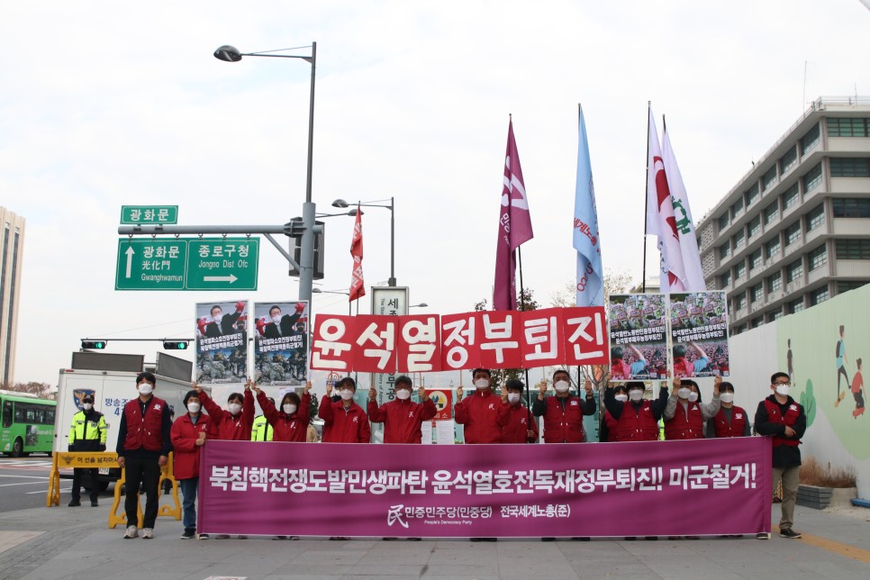 이날 민중민주당·전국세계노총(준)은 미대사관앞에서 <북침핵전쟁도발민생파탄윤석열호전독재정부퇴진!미군철거!>공동집회를 진행했다. 민중민주당대표는 과거 역대정권들은 그나마 레드라인을 넘지않으며 가까스로 전쟁은 피했으나 윤석열정부는 자신들의 정치적목적을 위해 전쟁으로 무한질주하고있다면서 윤석열친미호전파쇼정부는 마주한 우리민중의 강한 퇴진요구를 덮기 위해 코리아반도의 군사적긴장을 더욱 고조시키며 친미친일사대굴욕외교행각에 힘을 기울이고 실제적인 <북침핵전쟁>을 벌이는 위험천만한 수순으로 가고있다고 힐난했다. 이어 우리민중은 일촉즉발의 실질적인 위기로 다가오는 전쟁의 위협속에 자신의 운명을 개척하기 위한 새로운 길을 모색하지않을수 없게 됐다면서 <세계가변하고있다.오늘날자각된세계민중의단결된투쟁으로민중이세계의주인이되는세계자주화의새로운시대가열리고있다.민중민주당은항쟁의기관차로서이땅에서미군을반드시철거시키고,윤석열정부를 퇴진시키고,민중민주의새세상을기필코앞당길것>이라고 목소리를 높였다.