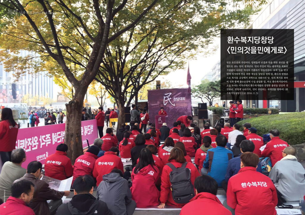 민은 모든것의 주인이다. 당원들의 단결과 민을 위한 헌신을 생명으로 삼는 당이 생겨난다. 민이 주인이 되는 종착역을 목표로 거침없이 나아갈 역사의 기관차가 만들어진다. 오직 민을 믿고 민에 의거하며 민을 위한 세상을 앞당길 민의 당, 환수의 방법론으로 복지를 공상에서 과학으로 전환시킨 당, 민의 복지를 위하여 민과 함께 환수운동에 나설 유일한 당, 바로 환수복지당이다. 오늘 우리는 이자리에서 환수복지당의 장엄한 출범을 당당히 선언한다. 힘차게 나아가자, 민이 주인되는 새세상을 향하여! (환수복지당창당선언문 2016.11.5)