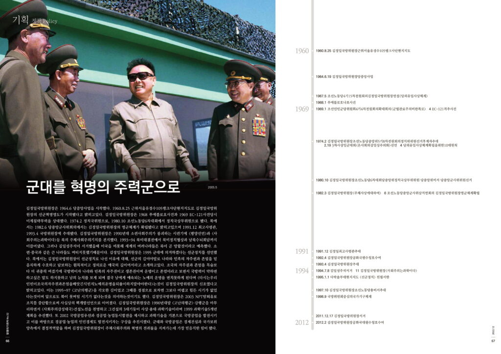 김정일국방위원장은 1964.6 당중앙사업을 시작했다. 1960.8.25 근위서울유경수105탱크사단현지지도로 김정일국방위원장의 선군혁명영도가 시작됐다고 밝히고있다. 김정일국방위원장은 1968 푸에블로호사건과 1969 EC-121사건당시 미제침략무력을 상대했다. 1974.2 정치국위원으로, 1980.10 조선노동당6차대회에서 정치국상무위원으로 됐다. 북에서는 1982.6 당중앙군사위회의에서는 김정일국방위원장의 영군체계가 확립됐다고 밝히고있으며 1991.12 최고사령관, 1993.4 국방위원장에 추대됐다. 김정일국방위원장은 1990년대 소련사회주의가 붕괴하는 시련기에 <평양선언>과 <사회주의는과학이다>등 북의 주체사회주의기치를 견지했다. 1993~94 북미대결전에서 북미정치협상과 남북수뇌회담까지 이끌어냈다. 그러나 김일성주석이 서거했을때 미국을 비롯해 세계의 여러나라들은 북이 곧 망할것이라고 예측했다. 소련·중국과 같은 큰 나라들도 버티지못했기때문이다. 김정일국방위원장은 1995 군대에 의거하겠다는 선군정치를 선언했다. 북에서는 김정일국방위원장이 선군정치로 나선 이유에 대해, 선군의 길이야말로 나라와 민족의 자주권과 존엄을 믿음직하게 수호하고 담보하는 원칙적이고 정의로운 애국의 길이어서라고 소개하고있다. 조국의 자주권과 존엄을 목숨보다 더 귀중히 여겼기에 국방력이자 나라와 민족의 자주권이고 생존권이며 운명이고 존엄이라고 보면서 국방력이 약하면 하고싶은 말도 하지못하고 남의 눈치를 보게 되며 결국 남에게 예속되는 노예의 운명을 면치못하게 된다며 <다시는우리인민이조국의자주권과존엄을빼앗긴식민지노예의운명을되풀이하지말아야한다>는것이 김정일국방위원장의 신조였다고 밝히고있다. 이는 1995~97 <고난의행군>을 각오한 길이었고 그때를 정점으로 보자면 그보다 어렵고 힘든 시기가 없었다는것이며 앞으로도 북이 못버틸 시기가 없다는것을 의미하는것이기도 했다. 김정일국방위원장은 2003 NPT탈퇴유보조치를 중단함으로써 사실상의 핵개발선언으로 이어졌다. 김정일국방위원장은 1990년대말 <고난의행군>·강행군을 마무리하면서 <사회주의강성대국>건설노선을 천명하고 그건설의 3대기둥이 사상·총대·과학기술이라며 1999 과학기술5개년계획을 추진했다. 또 2002 국방공업우선과 경공업·농업동시발전을 제시하고 과학기술을 기본으로 국방공업을 발전시키고 이를 바탕으로 경공업·농업의 인민경제도 발전시키자는 구상을 추진시켰다. 군대와 국방공업은 경제건설과 국가보위 양측에서 결정적역할을 하며 김정일국방위원장이 주체사회주의와 혁명의 전취물을 지켜가는데 가장 믿음직한 힘이 됐다.