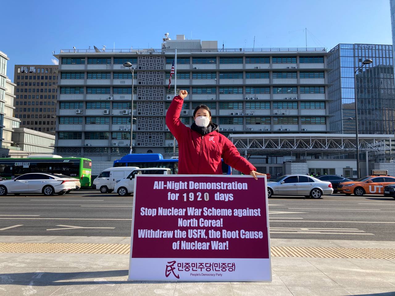 30일 민중민주당(민중당)은 미대사관앞에서 <선제타격망발 윤석열무리청산! 북침핵전쟁책동중단! 핵전쟁화근 미군철거!> 구호를 들고 평화시위를 2355일째 전개했다.
