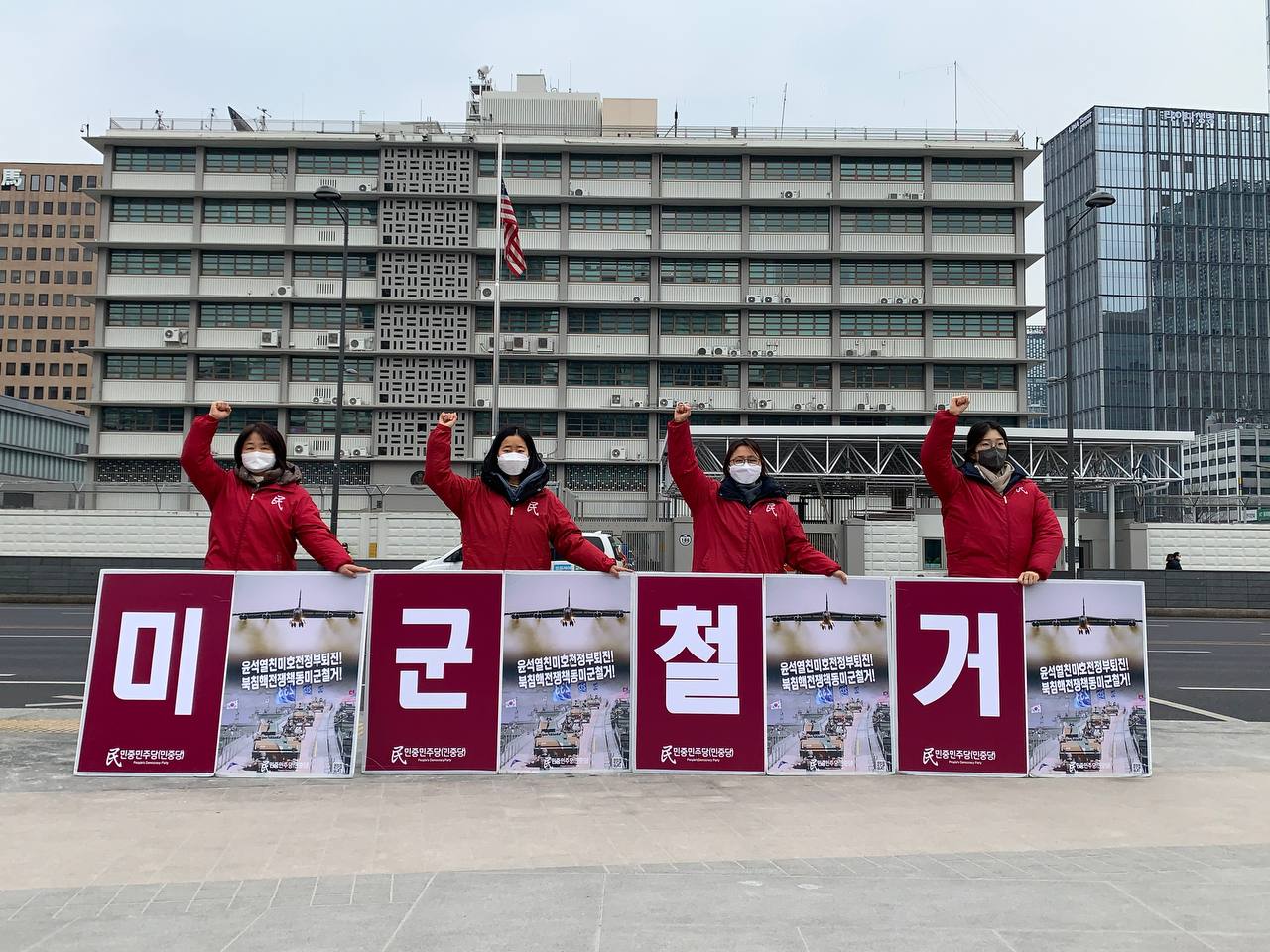 31일 민중민주당(민중당)은 미대사관앞에서 <선제타격망발 윤석열무리청산! 북침핵전쟁책동중단! 핵전쟁화근 미군철거!> 구호를 들고 평화시위를 2356일째 전개했다.