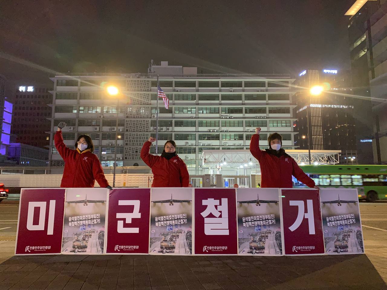 8일 민중민주당(민중당)은 미대사관앞에서 <윤석열친미호전정부퇴진! 북침핵전쟁책동중단! 핵전쟁화근 미군철거!> 구호를 들고 평화시위를 2364일째 전개했다.