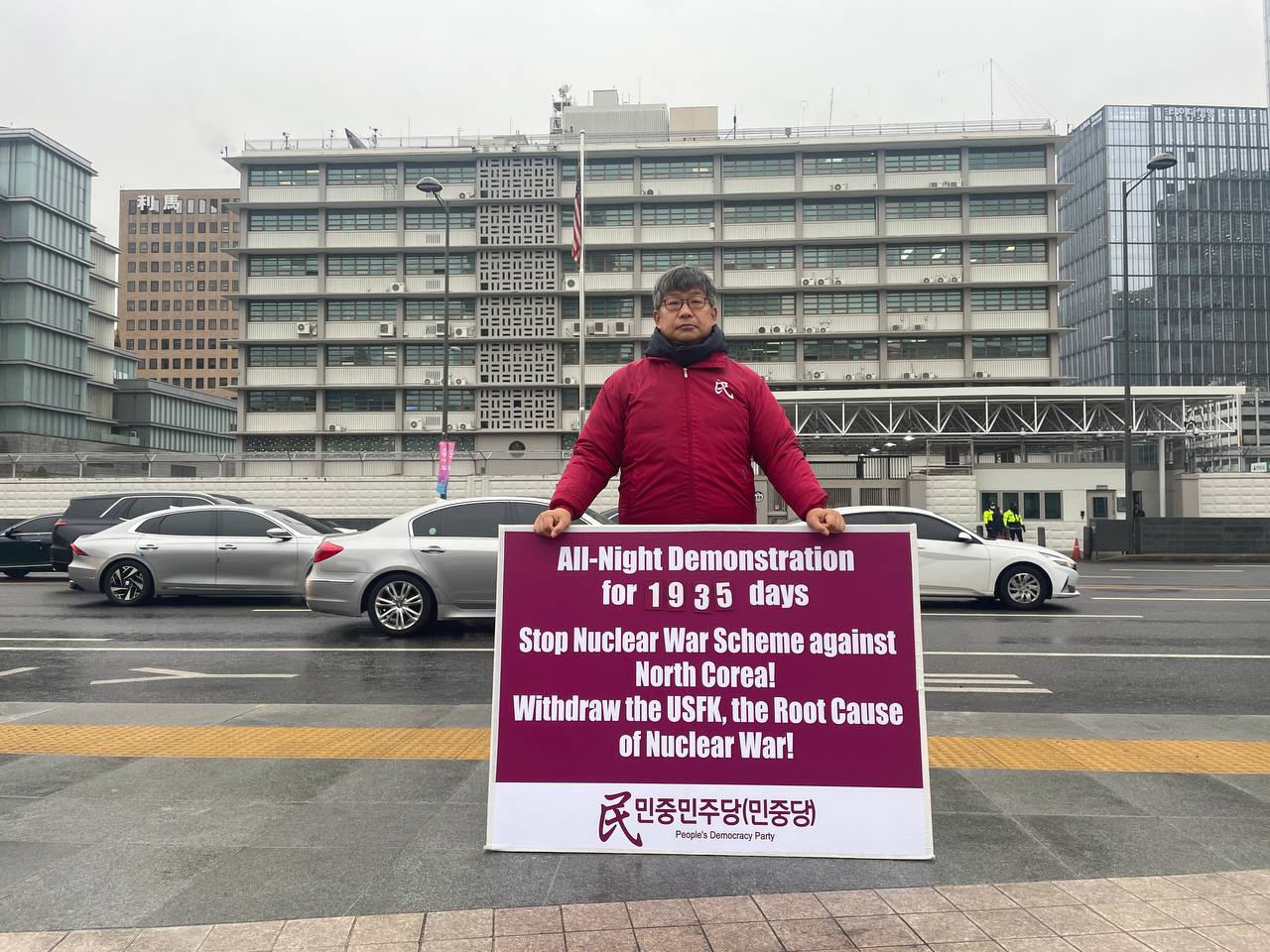 13일 민중민주당(민중당)은 미대사관앞에서 <윤석열친미호전정부퇴진! 북침핵전쟁책동중단! 핵전쟁화근 미군철거!> 구호를 들고 평화시위를 2369일째 전개했다