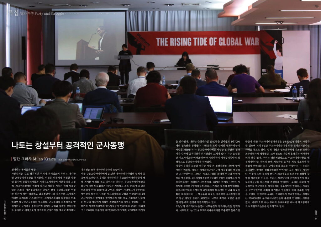 이것이 우리가 오늘날 역사상 가장 큰 전쟁기계인 나토에 맞서야하는 이유다. 나토는 세계최대군사기구며 제국주의의 핵심적인 군사수단이다. 나토는 미국군사력의 확대며 미국의 이익에 따라 행동한다. 2차세계대전종전 4년뒤인 1949 설립됐으며 바르샤바조약이 체결되기 6년전이다. 20세기 마지막 10년이 시작될때 선언한 <방어적성격>이라는 가식은 훨씬더 분명해졌다. 바르샤바조약의 소멸뒤에 나토해체가 따른것이 아니라 나토강화가 따른것이다. … 창설부터 나토는 공격적인 군사동맹이었고 항상 개입할 준비가 돼있었다. 나토의 확장과 도발은 불안정·긴장·폭력·전쟁에 직접적책임이 있다.