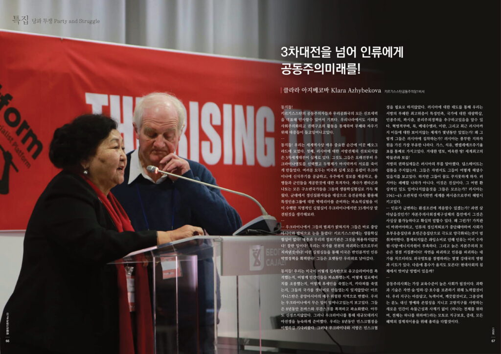 키르기스스탄의 공동주의자들과 우리공화국의 모든 진보세력을 대표해 인사할수 있어서 기쁘다. 우리나라에서도 사회를 사회주의화하고 권력구조의 활동을 통제하며 부패와 싸우기 위해 대중들이 들고일어나고있다.