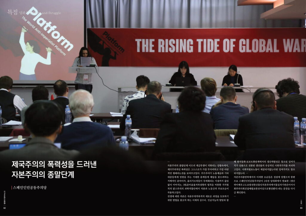 자본주의종말하에서의 이러한 모순들은 정점에 달했으며 한편으로 스페인인민공동주의당이 2년전 당대회에서 발표한 <생산 력이매우고도로발전한산물인자본주의에서물질적기반은이미사 회주의사회건설에필요한것이상으로형성됐다>라는 문장을 다시금 확인한다.