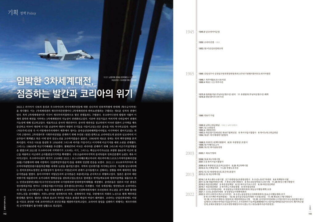 2022.2 러시아가 나토의 동진과 우크라이나의 러시아계주민들에 대한 신나치의 민족적차별에 반대해 <특수군사작전>을 개시했다. 이는 1차세계대전의 제국주의간전쟁이나 2차세계대전의 반파쇼전쟁과는 구별되는 새로운 성격의 전쟁이었다. 특히 2차세계대전이후 미국이 제국주의적침략으로 벌인 전쟁들과도 구별된다. 우크라이나전의 발발과 더불어 미제의 침략과 패권을 거부하는 3차세계대전의 가능성이 전면화되고있다. 이른바 전문가들은 여러지역 나라들에서 전쟁의 가능성에 대해 경고하고있다. 대표적으로 중국의 대만전이다. 중국의 대만전을 경고하면서 미국과 일본이 군사력을 계속 증강하고 미국이 대만에 무기를 공급하며 대만이 대량의 무기들을 사들이고있는것은 중국을 더욱 자극하고있다. 이른바 <자유주의>진영 즉 미·서방제국주의세력이 배후에서 벌이는 중국공산당와해책동이야말로 이지역에서 벌어지고있는 위기의 근원이다. 2차대전이후 사회주의진영을 견제하기 위해 추진된 <냉전>정책으로 코리아반도의 분단과 남코리아의 미군주둔이 획책됐고 북은 이에 맞서 강군노선을 고수하지않을수 없었다. 1990년대 새로운 정세는 북의 핵무장화를 본격화시켰다. 미국은 나토를 창설한 후 1950년대 그리스와 터키를 가입시키고 이지역에 미군기지를 세워 소련을 견제했다. 그리스는 1980년대 미군기지폐쇄를 추진했다. 몇해전부터 미국은 러시아를 견제하기 위해 그리스와 미군기지설치협상을 벌였으며 2021말 우크라이나에 지역위기가 고조되는 시기, 그리스는 핵심군사기지4곳을 포함한 총8곳에 미군의 접근을 허용하고 미군과의 군사훈련실시지역을 확대했다. 구유고슬라비아지역의 분리독립과 민족간분쟁의 논란도 계속 이어지고있다. 우크라이나전의 위기가 고조되던 2022.1 보스니아헤르체고비나의 세르비아계<스르브스카자치공화국건립30돌>기념행사에 대해 서방에서 <인종학살부정금지>등을 내세워 민감한 반응을 보였다. 2022.11 코소보자치주측의 세르비아차량번호판사용등록문제를 내세워 논란을 불러일으켰다. 지역의 안보위기를 자극하는것이다. 지난해 남코리아에는 친미호전파쇼정권인 윤석열정부가 들어서고 미일남3국의 관계가 군사동맹으로 강화되는 경향을 띠며 대대적인 합동군사연습을 벌였다. 동아시아에서 미일남3국의 군사연습은 북중러3국을 군사적으로 위협하고있다. 일본은 중국의 대만전위기에 대응한다며 오키나와의 병력증강을 검토하고있는것으로 알려졌고 반격능력보유와 방위비증액을 내용으로 하는 안전보장관련3대문서(국가안전보장전략·국가방위전략·방위력정비계획)를 개정했다. 중언론들은 일본의 이런 결정은 전수방위공격을 벗어나 <선제공격용>미사일을 갖추겠다는것이라고 우려했다. 이런 국제정세는 발칸반도와 코리아반도의 위기를 고조시키고있다. 북은 국제관계에서 코리아반도의 지정학적위치에서 우리민족의 주도권을 갖기 위해 철저한 자주노선을 견지해왔다. 자주노선이란 정치에서의 자주, 경제에서의 자립, 국방에서의 자위의 노선으로 현재 핵무력을 완성해온 힘이다. 발칸은 민족과 종교의 차이를 이유로 분쟁과 학살의 마당이 돼버렸다. 코리아는 단일민족임에도 이념을 이유로 분단된 이래 코리아반도의 분단문제를 해결하지못하고있다. 코리아의 통일을 실현하기 위해서는 제국주의와의 군사적대결이 불가피한 상황으로 되고있다.