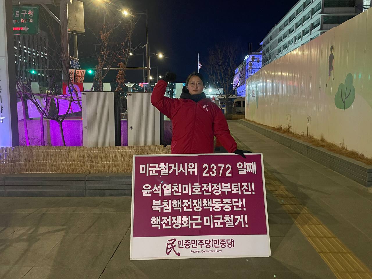 16일 민중민주당(민중당)은 미대사관앞에서 <윤석열친미호전정부퇴진! 북침핵전쟁책동중단! 핵전쟁화근 미군철거!> 구호를 들고 평화시위를 2372일째 전개했다