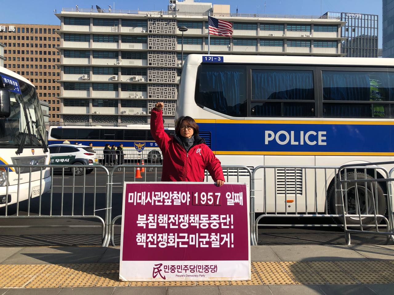 4일 민중민주당(민중당)은 미대사관앞에서 <윤석열친미호전정부퇴진! 북침핵전쟁책동중단! 핵전쟁화근 미군철거!> 구호를 들고 평화시위를 2391일째 전개했다