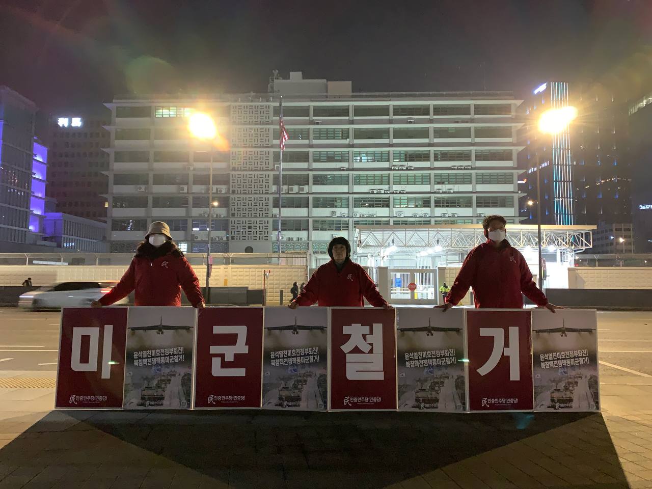 11일 민중민주당(민중당)은 미대사관앞에서 <윤석열친미호전정부퇴진! 북침핵전쟁책동중단! 핵전쟁화근 미군철거!> 구호를 들고 평화시위를 2398일째 전개했다