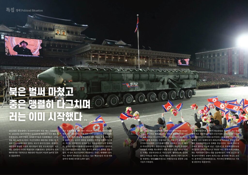 남의 윤석열친미호전정부가 파쇼탄압을 가속화한 지난 한달동안 북은 정찰위성2기발사·무인기침투·초대형방사포연말연시시험발사·군사적내용으로가득찬1.1보도·열병식등으로 대응했다. 모두 일제에 맞서 최후공격을 하기직전 정찰을 강화했던 조선인민혁명군의 전례를 연상시킨다. 지난해 내내 남측에서 벌어진 미군과 남군, <일본군>의 북침핵전쟁연습들에 철저히 준비된 대응으로 맞섰던 북은 반격·타격준비완료에도 여러차원이 있다는것을 입증해보였다. 이제 2023년 올해 동아시아에서 전쟁이 터지는것은 불가피한 현실로 보인다. 본격적인 3차세계대전으로, 역사적인 반제대전으로 기록될 결정적인 대결전이다.