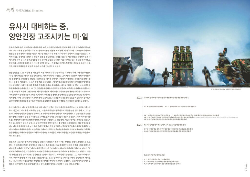 일언론은 1.20 미주방위군이 대만군을 훈련시키고있으며 하와이주등 주방위군부대가 포함됐다고 보도했다. 자국판매의 무기사용법정도의 교육에서 훈련내용을 더욱 확대한것이라고 전했다. 미의 대만주재대사격인 미재대만협회(AIT)대만사무처장은 SNS에 <미의대만지지는반석과같이굳건하다>며 이것이 <대만해협의평화와안정,더안정적인인도·태평양지역건설에도움이될것이라고굳게믿는다>고 밝혔다. 미군이 대만군훈련을 공개적으로 인정한것은 올해가 처음이다. 차이잉원대만총통은 1.22 북부타이베이의 다즈지역푸시병영에 배치된 헌병기갑239대대를, 1.23 중부타이중시타이핑지역의 핑딩병영에 배치된 육군10군단산하 기갑586여단 연합병종영3대대를 연이어 방문하며 독려했다. 1.28 매카시신임미하원의장의 대만방문추진소식이 알려지면서 양안사이의 정치군사적긴장이 더욱 고조되고있다.