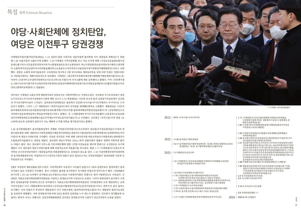 1.26 윤석열대통령이 용산대통령실에서 진행된 국민당(국민의힘)지도부오찬에서 정보원(국가정보원)대공수사권의 경찰이관문제에 대해 <해외의수사와연결돼있기때문에국내에있는경찰이수사를전담하는부분에대해서는살펴봐야하는여지가있다>며 대공수사권존치를 시사했다. 다음날 민주당은 이에 대해 <대국민사찰·여론조작을다시허용하려는반헌법적시도를용납하지않겠다>는 입장을 내놨다. 정보원의 대공수사권은 2024.1부터 경찰이관이 법률로 정해져 국회의결 없이는 바꿀수 없다. 최근 정보원이 민주노총·시민사회단체에 대한 <간첩>사건놀음을 벌이며 한편으로 조선일보등 보수매체들이 나서 정보원의 대공수사권이관에 대해 비판적논조의 여론몰이를 하고있다. 한편 1.17 <이태원참사>국정조사 마지막날 조수진국민당의원이 <청담동술자리>의혹관련발언으로 유족들의 분노를 샀다. 1.30 이상민행정안전부장관파면과 윤석열대통령의사과, 독립적조사기구설치요구등의 내용이 담긴 결과보고서는 국민당의원들이 집단퇴장한 가운데 민주당단독으로 처리됐다.