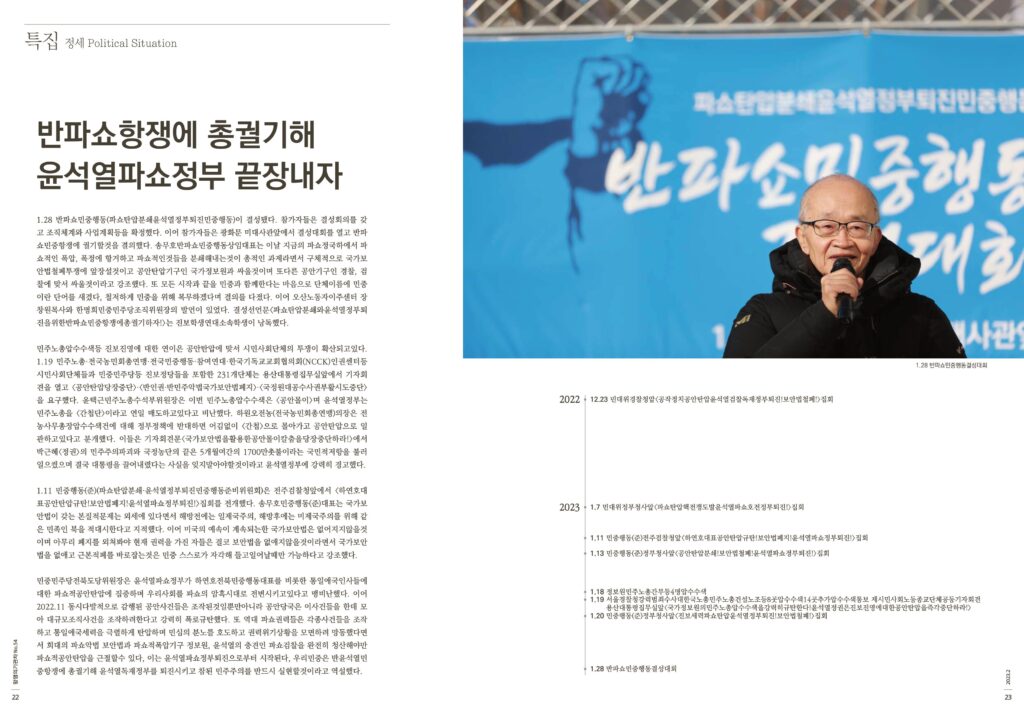 민주노총압수수색등 진보진영에 대한 연이은 공안탄압에 맞서 시민사회단체의 투쟁이 확산되고있다. 1.19 민주노총·전국농민회총연맹·전국민중행동·참여연대·한국기독교교회협의회(NCCK)인권센터등 시민사회단체들과 민중민주당등 진보정당들을 포함한 231개단체는 용산대통령집무실앞에서 기자회견을 열고 <공안탄압당장중단>·<반인권·반민주악법국가보안법폐지>·<국정원대공수사권부활시도중단>을 요구했다. 윤택근민주노총수석부위원장은 이번 민주노총압수수색은 <공안몰이>며 윤석열정부는 민주노총을 <간첩단>이라고 연일 매도하고있다고 비난했다. 하원오전농(전국농민회총연맹)의장은 전농사무총장압수수색건에 대해 정부정책에 반대하면 어김없이 <간첩>으로 몰아가고 공안탄압으로 일관하고있다고 분개했다. 이들은 기자회견문<국가보안법을활용한공안몰이칼춤을당장중단하라!>에서 박근혜<정권>의 민주주의파괴와 국정농단의 끝은 5개월여간의 1700만촛불이라는 국민적저항을 불러일으켰으며 결국 대통령을 끌어내렸다는 사실을 잊지말아야할것이라고 윤석열정부에 강력히 경고했다.