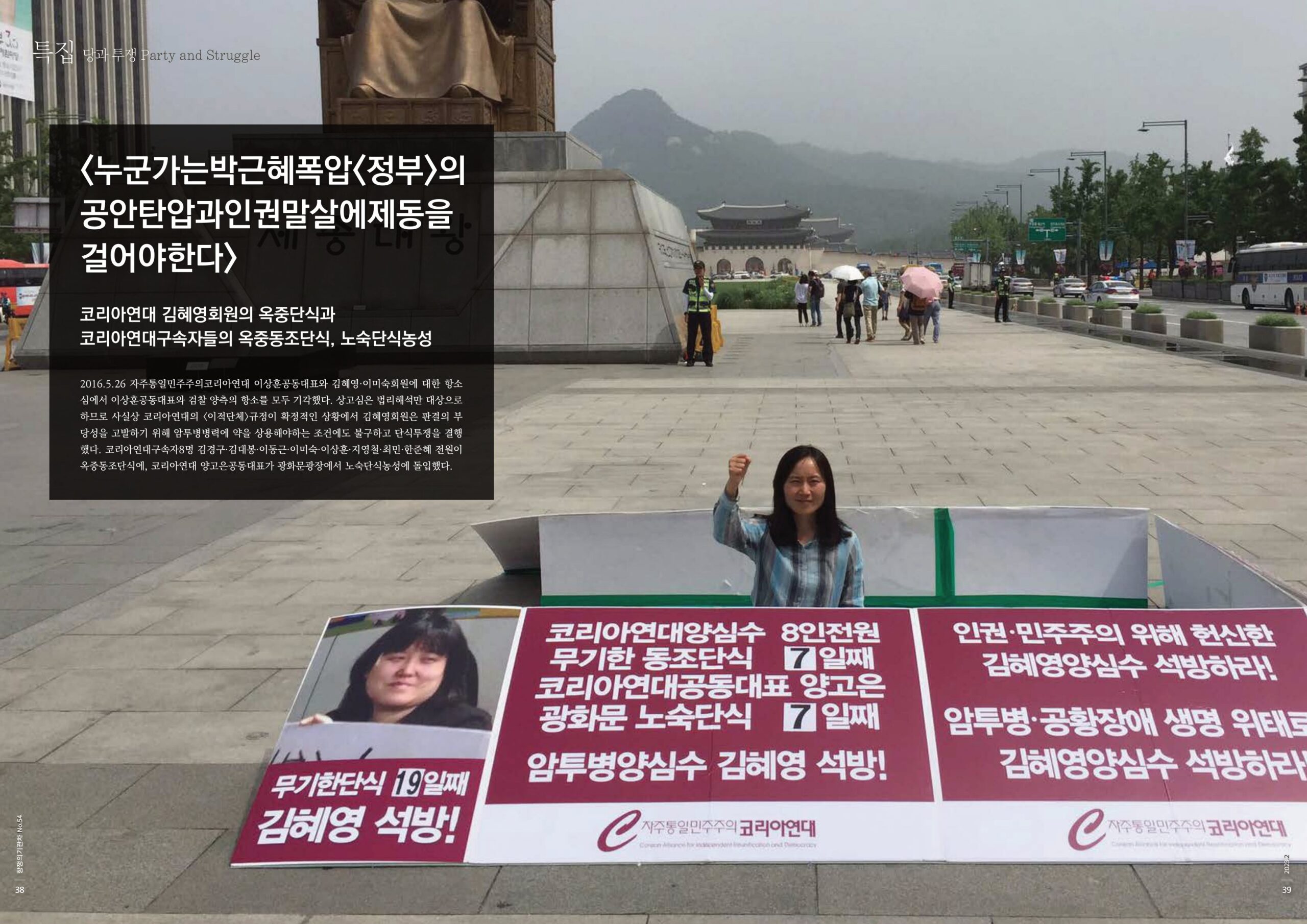 2016.5.26 자주통일민주주의코리아연대 이상훈공동대표와 김혜영·이미숙회원에 대한 항소심에서 이상훈공동대표와 검찰 양측의 항소를 모두 기각했다. 상고심은 법리해석만 대상으로 하므로 사실상 코리아연대의 <이적단체>규정이 확정적인 상황에서 김혜영회원은 판결의 부당성을 고발하기 위해 암투병병력에 약을 상용해야하는 조건에도 불구하고 단식투쟁을 결행했다. 코리아연대구속자8명 김경구·김대봉·이동근·이미숙·이상훈·지영철·최민·한준혜 전원이 옥중동조단식에, 코리아연대 양고은공동대표가 광화문광장에서 노숙단식농성에 돌입했다.