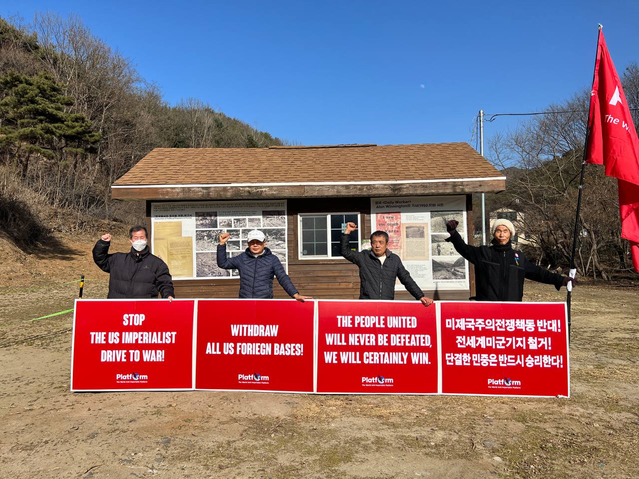 남코리아에서는 전국 22개도시에서 반제동시투쟁이 전개중이다. 2일 오후 2시 대전산내학살에서 민중민주당(민중당)대전시당당원들과 지역활동가들은 <미제국주의전쟁책동 반대! 전세계미군기지 철거! 단결한 민중은 반드시 승리한다!> 구호피시를 내세웠다.