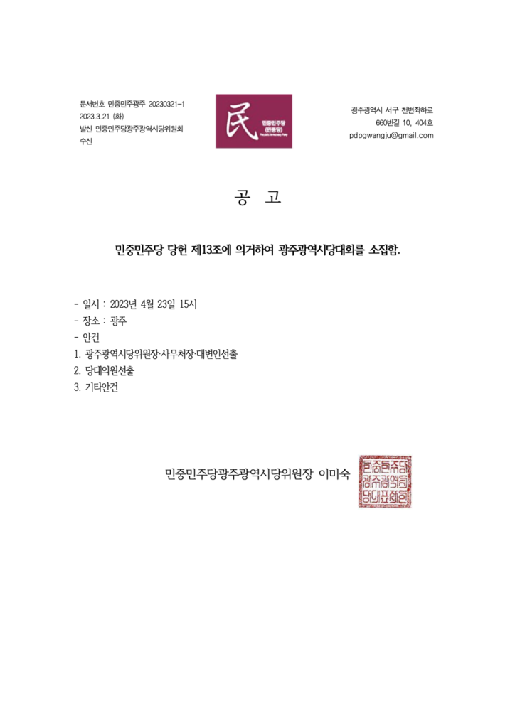 [공고] 민중민주당 광주시당 당대회 소집