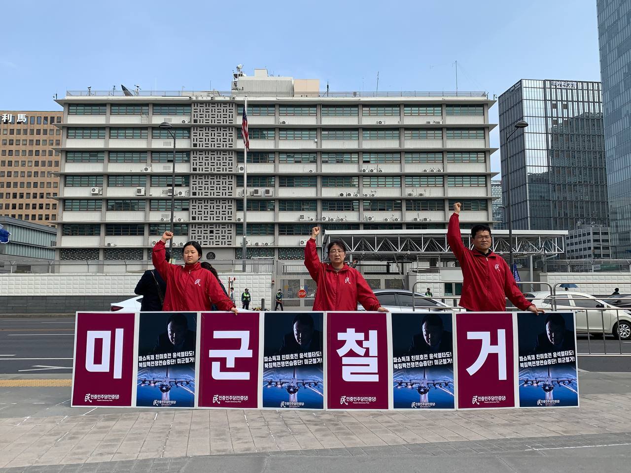 22일 민중민주당(민중당)은 미대사관앞에서 <윤석열친미호전정부퇴진! 북침핵전쟁책동중단! 핵전쟁화근 미군철거!> 구호를 들고 평화시위를 2437일째 전개했다미대사관정문 맞은편에서는 우리말과 영어로 된 구호 <북침핵전쟁책동중단! 핵전쟁화근미군철거!>를 들고 <광화문미대사관앞철야시위>를 진행했다.시위는 <제재반대·평화협상100일행동>과 반전평화·악폐청산을 위한 <무기한비상행동>을 합쳐 2003일째 이어졌다.<윤석열친미호전정부퇴진! 북침핵전쟁책동미군철거!> 미대사관앞정당연설회는 1479일째 진행됐다.