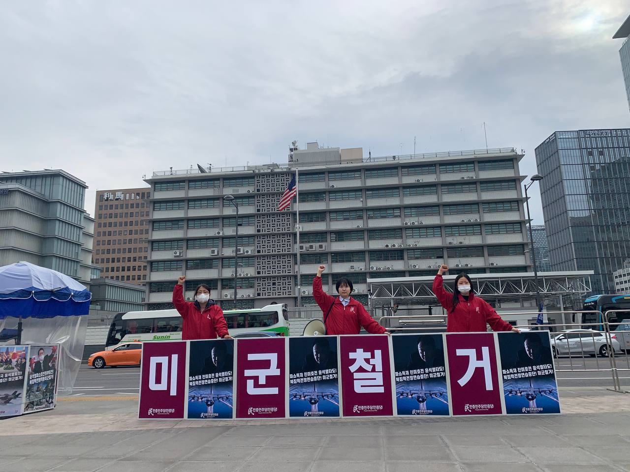 23일 민중민주당(민중당)은 미대사관앞에서 <윤석열친미호전정부퇴진! 북침핵전쟁책동중단! 핵전쟁화근 미군철거!> 구호를 들고 평화시위를 2438일째 전개했다
