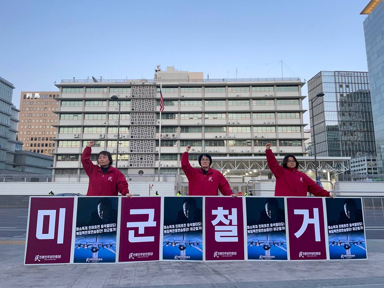 26일 민중민주당(민중당)은 미대사관앞에서 <윤석열친미호전정부퇴진! 북침핵전쟁책동중단! 핵전쟁화근 미군철거!> 구호를 들고 평화시위를 2441일째 전개했다