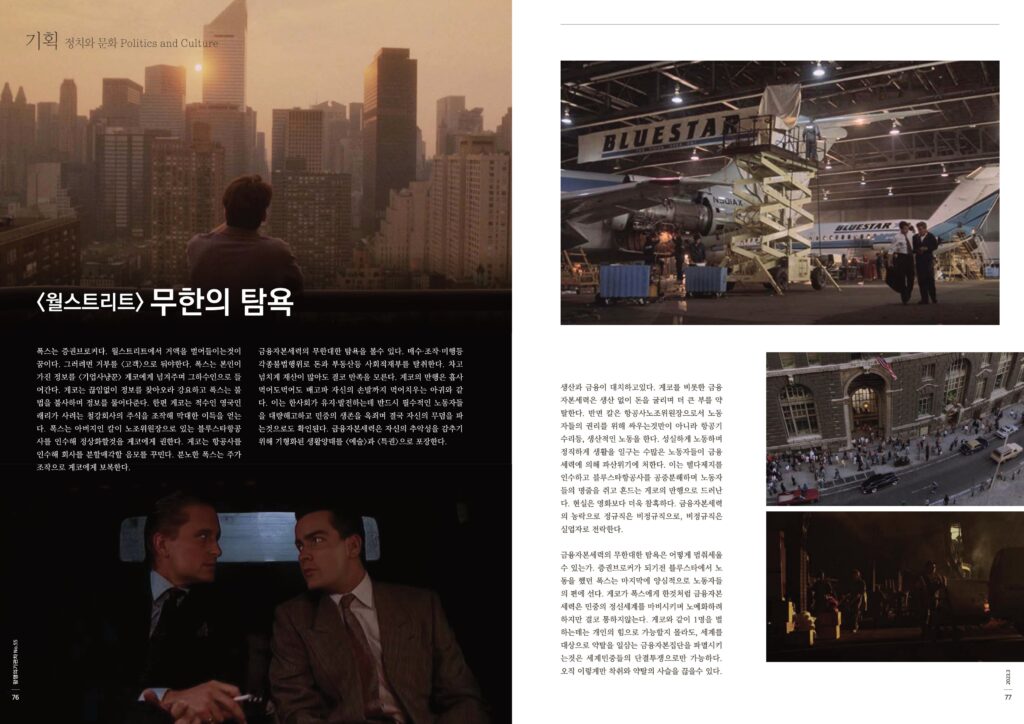 생산과 금융이 대치하고있다. 게코를 비롯한 금융자본세력은 생산 없이 돈을 굴리며 더 큰 부를 약탈한다. 반면 칼은 항공사노조위원장으로서 노동자들의 권리를 위해 싸우는것만이 아니라 항공기수리등, 생산적인 노동을 한다. 성실하게 노동하며 정직하게 생활을 일구는 수많은 노동자들이 금융세력에 의해 파산위기에 처한다. 이는 텔다제지를 인수하고 블루스타항공사를 공중분해하며 노동자들의 명줄을 쥐고 흔드는 게코의 만행으로 드러난다. 현실은 영화보다 더욱 참혹하다. 금융자본세력의 농락으로 정규직은 비정규직으로, 비정규직은 실업자로 전락한다.