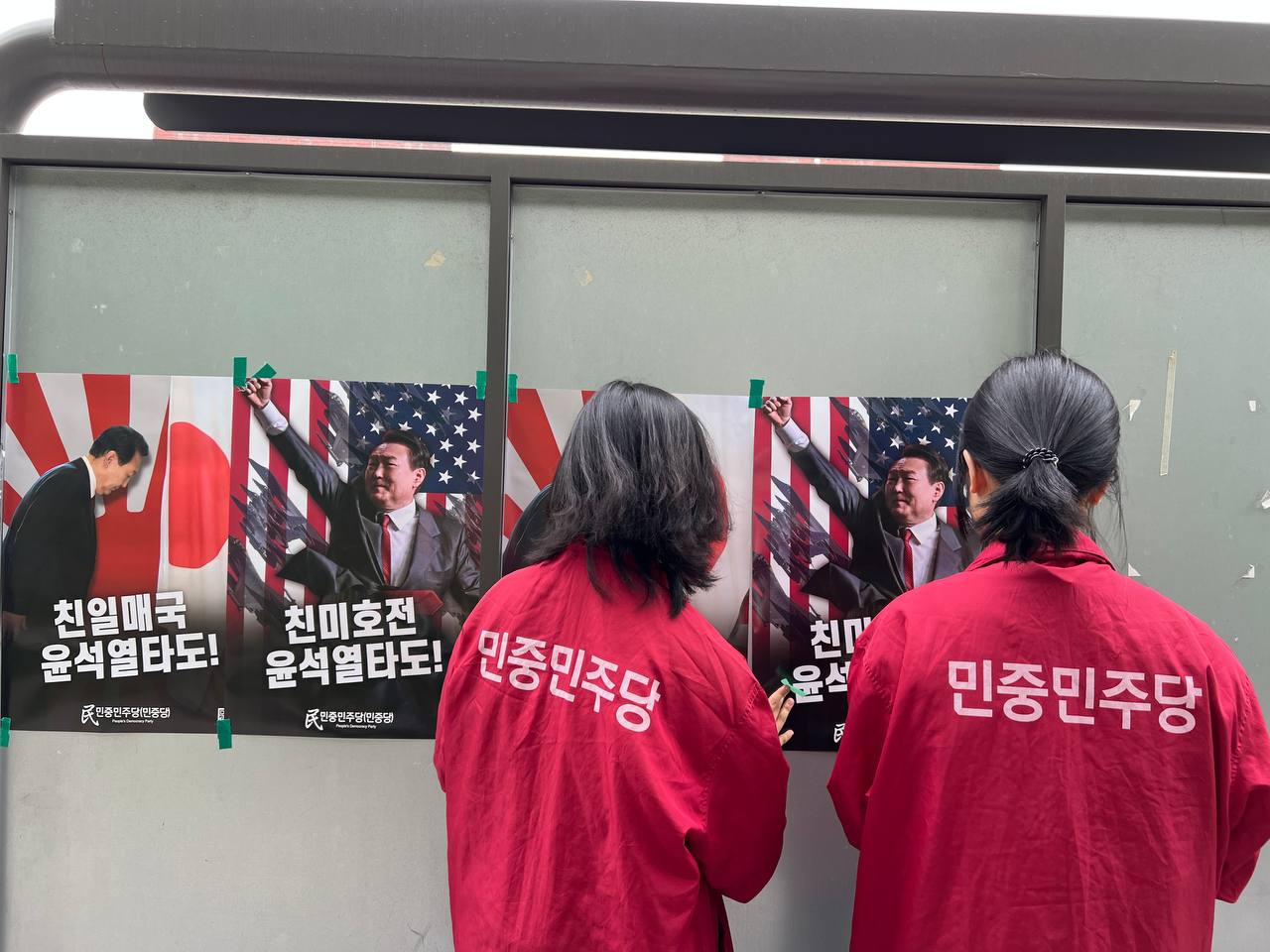 정당연설회 윤석열타도청년학생투쟁선봉대 고려대 등 대학가선전전 … 포스터106장 부착 2023년 4월 21일 FacebookTwitter 21일 윤석열타도청년학생투쟁선봉대는 고려대학교, 성신여자대학교, 순천향대학교에서 선전전을 진행했다. 민중민주당학생당원들은 포스터 <친일매국 윤석열타도!>, <친미호전 윤석열타도!>, <친일매국 윤석열타도! 친미호전 윤석열타도!>를 총 106장 부착했다. 게시판에 붙은 포스터에 대학생들이 많은 관심을 보였다. 투쟁은 계속된다.