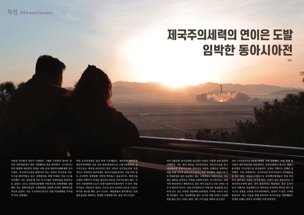 미는 <미일남3각군사동맹>체제를 구축·강화했다. 이를 위해 윤석열의 정치적입지를 여당내에서, 남정치판에서 확고히 해줬고 윤석열을 기시다밑으로 밀어넣었다. 군대는 서열이고 전쟁은 임박했다. 이런 측면에서도 남코리아전·동아시아전이 임박했음을 잘 알수 있다. 미일남3국합동으로 북침핵전쟁연습이 연일 미친듯이 벌어지는 이유도 여기에 있다. 그러니 북의 대응조치도 전대미문일수밖에 없다. 북의 결전의지는 확고하다. 북은 유사시 남의 지휘부만 전술핵탄으로 벼락처럼 파괴하며 항복을 받는 방식으로 전쟁을 초반에 마무리하려한다. 당연히 미·일은 지켜만 볼것이다. 북은 이날을 위해 분투하며 핵·미사일을 개발해왔다. 전쟁의 승패는 얼마나 준비됐는가에 달려있다.