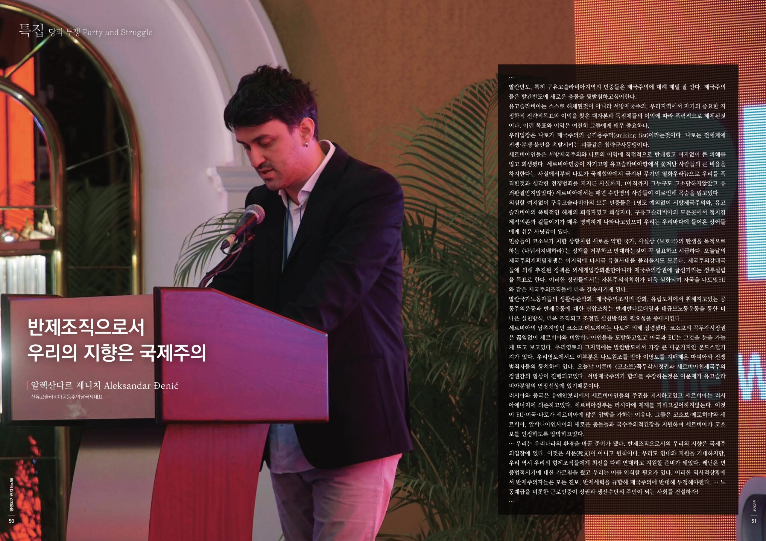 … 우리는 우리나라의 환경을 바꿀 준비가 됐다. 반제조직으로서의 우리의 지향은 국제주의입장에 있다. 이것은 사문(死文)이 아니고 원칙이다. 우리도 연대와 지원을 기대하지만, 우리 역시 우리의 형제조직들에게 최선을 다해 연대하고 지원할 준비가 돼있다. 레닌은 변증법적시기에 대한 가르침을 줬고 우리는 이를 인식할 필요가 있다. 이러한 역사적상황에서 반제주의자들은 모든 진보, 반제세력을 규합해 제국주의에 반대해 투쟁해야한다. … 노동계급을 비롯한 근로민중이 정권과 생산수단의 주인이 되는 사회를 건설하자!