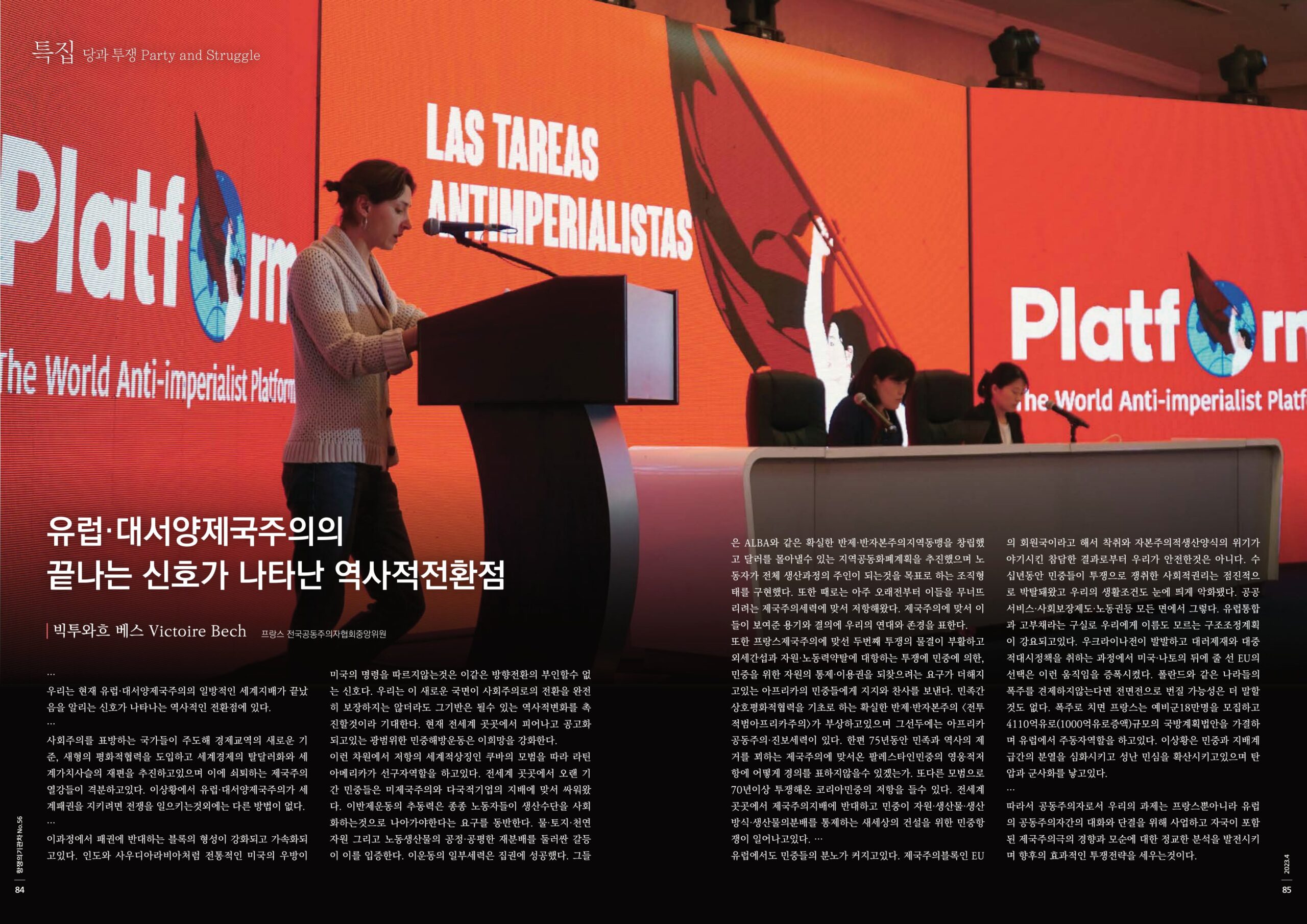 또한 프랑스제국주의에 맞선 두번째 투쟁의 물결이 부활하고 외세간섭과 자원·노동력약탈에 대항하는 투쟁에 민중에 의한, 민중을 위한 자원의 통제·이용권을 되찾으려는 요구가 더해지고있는 아프리카의 민중들에게 지지와 찬사를 보낸다. 민족간 상호평화적협력을 기초로 하는 확실한 반제·반자본주의 <전투적범아프리카주의>가 부상하고있으며 그선두에는 아프리카공동주의·진보세력이 있다. 한편 75년동안 민족과 역사의 제거를 꾀하는 제국주의에 맞서온 팔레스타인민중의 영웅적저항에 어떻게 경의를 표하지않을수 있겠는가. 또다른 모범으로 70년이상 투쟁해온 코리아민중의 저항을 들수 있다. 전세계 곳곳에서 제국주의지배에 반대하고 민중이 자원·생산물·생산방식·생산물의분배를 통제하는 새세상의 건설을 위한 민중항쟁이 일어나고있다. …