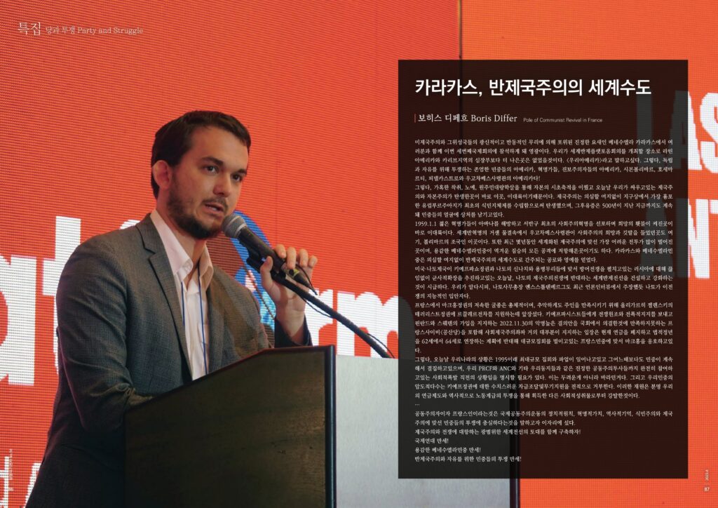 미제국주의와 그위성국들의 광신적이고 반동적인 무리에 의해 포위된 진정한 요새인 베네수엘라 카라카스에서 여러분과 함께 이번 세번째국제회의에 참석하게 돼 영광이다. 우리가 세계반제플랫포옴회의를 개최할 장소로 라틴아메리카와 카리브지역의 심장부보다 더 나은곳은 없었을것이다. <우리아메리카>라고 말하고싶다. 그렇다, 독립과 자유를 위해 투쟁하는 존엄한 민중들의 아메리카, 혁명가들, 진보주의자들의 아메리카, 시몬볼리바르, 호세마르티, 피델카스트로와 우고차베스사령관의 아메리카다!