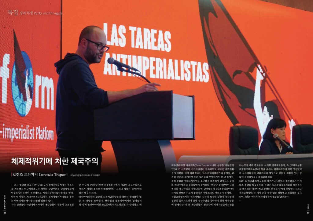 라틴아메리카의 민중과 노동계급의당들의 결의는 반격할수 있는 큰 역량을 보여줬다. 브라질과 콜롬비아에서의 선거승리와 함께 볼리비아에선 MAS(사회주의로의운동)가 승리하고 베네수엘라에선 애국의축(Polo Patriótico)이 성공을 거두면서 2020.10 시작됐던 선거사이클이 마무리되고 새로운 국면전환을 맞이했다. 이에 대해 우리는 모든 라틴아메리카의 동지들, 완전히 난관의 과정이었지만 일관성의 모범이기도 한 과정에서, 특히 봉쇄와 쿠데타시도에도 불구하고 계속해서 앞장서온 쿠바와 베네수엘라의 등대들에게 감사하다. 오늘날 북미뿐만아니라 현대의 제국주의의 약한고리인 남미대륙이 <사회주의와야만>사이의 선택의 기로에 놓인것은 무엇보다도 여러분 덕분이다.