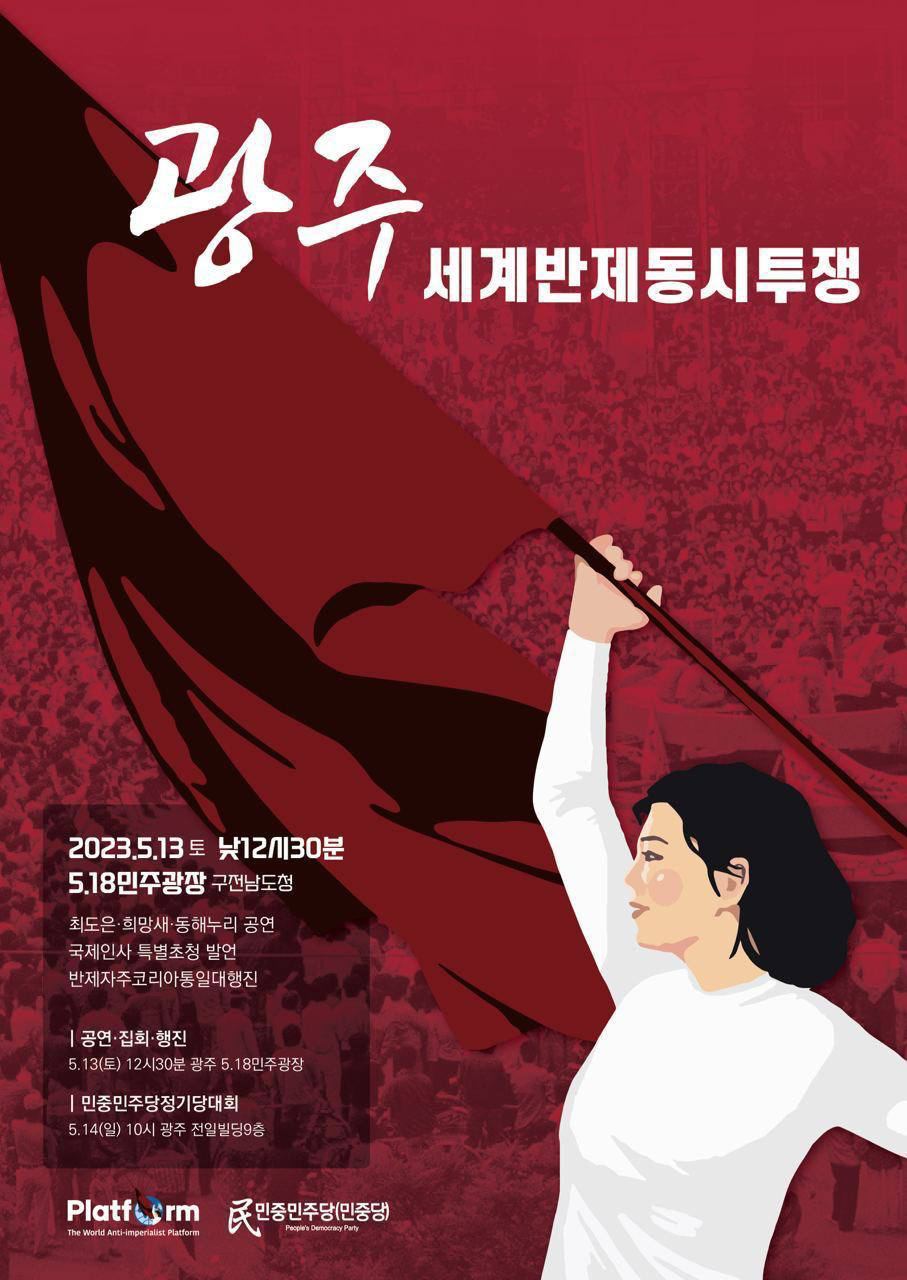 소식 [공지] 2023년 5월13일 광주세계반제동시투쟁 일정안내 2023년 5월 10일 FacebookTwitter 세계반제플랫포옴(The World Anti-imperialist Platform) 주최로 5월13일 낮 12시30분 광주 5.18민주광장에서 세게반제동시투쟁이 진행됩니다. 투쟁은 최도은·동해누리·희망새공연, 국제인사특별초청발언, 반제자주코리아통일대행진으로 구성됩니다. 많은 참여바랍니다.