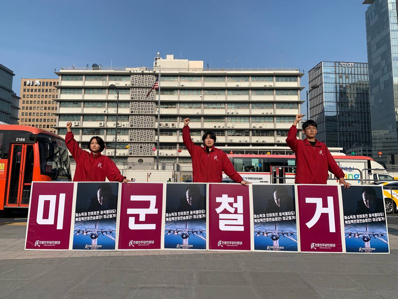 12일 민중민주당(민중당)은 미대사관앞에서 <윤석열친미호전정부퇴진! 북침핵전쟁책동중단! 핵전쟁화근 미군철거!> 구호를 들고 평화시위를 2488일째 전개했다.