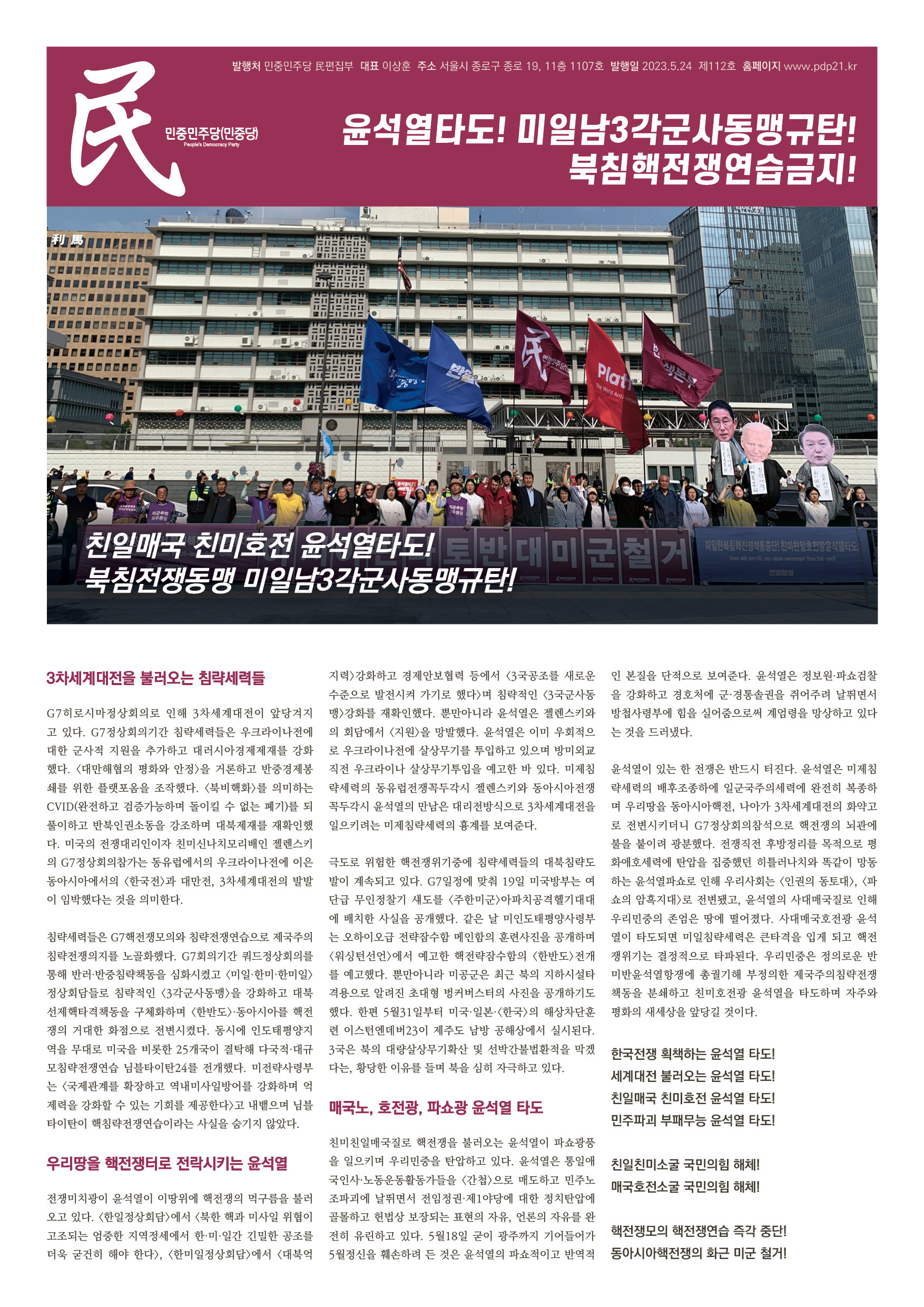 – 민중민주당 세계반제플랫포옴 등 5개당·단체공동집회 <아시아판나토획책G7반대! 친미친일호전광윤석열타도!> (21세기민족일보, 2023.5.20)