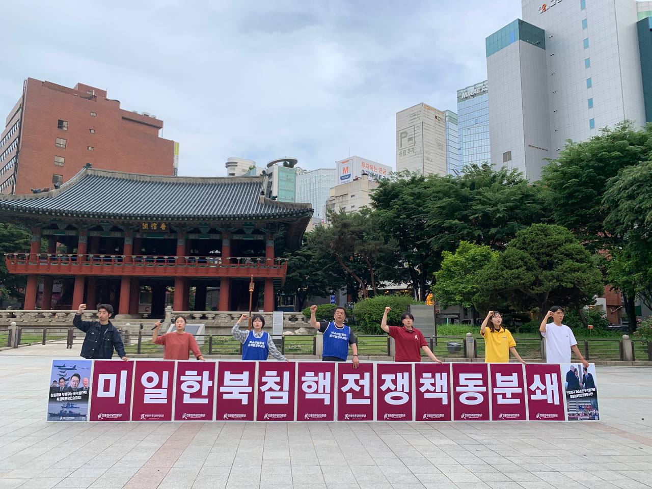 참가자들은 구호 <미일한북침핵전쟁책동 분쇄하자!>, <친미친일호전파쇼 윤석열 타도하자!>, <반제반파쇼투쟁으로 민중민주사회 앞당기자!>를 힘차게 외쳤다.