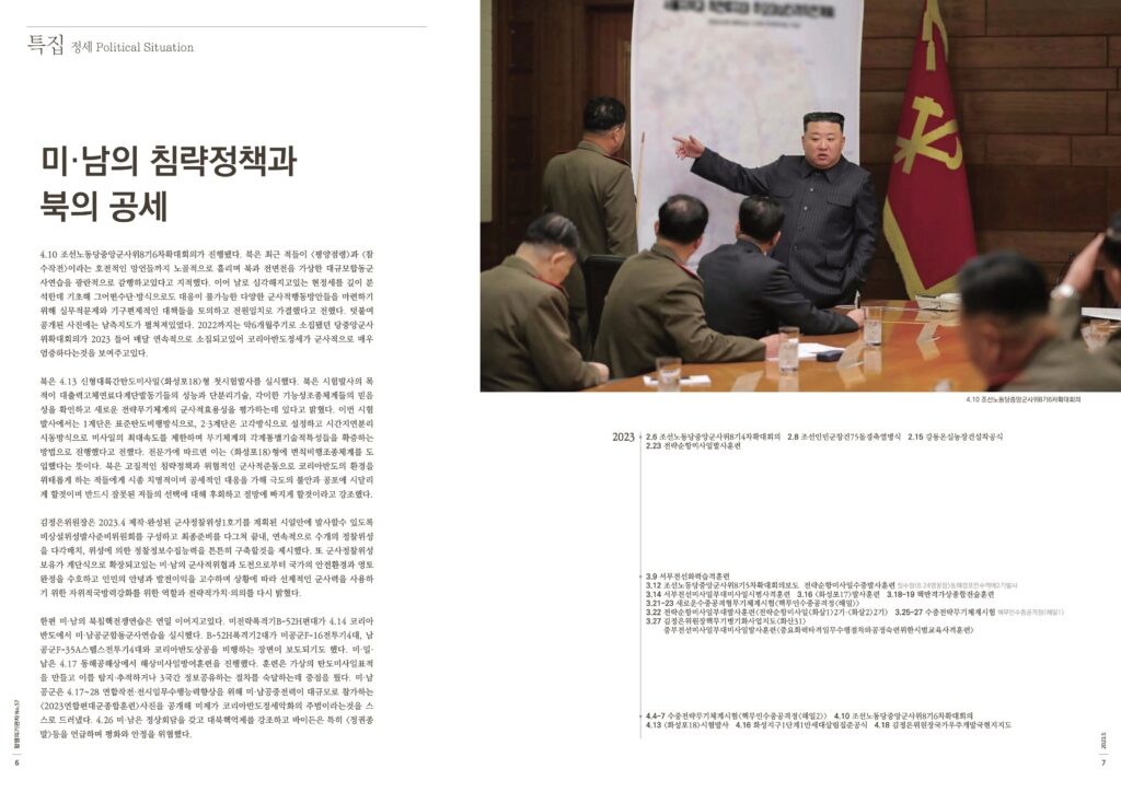 4.10 조선노동당중앙군사위8기6차확대회의가 진행됐다. 북은 최근 적들이 <평양점령>과 <참수작전>이라는 호전적인 망언들까지 노골적으로 흘리며 북과 전면전을 가상한 대규모합동군사연습을 광란적으로 감행하고있다고 지적했다. 이어 날로 심각해지고있는 현정세를 깊이 분석한데 기초해 그어떤수단·방식으로도 대응이 불가능한 다양한 군사적행동방안들을 마련하기 위해 실무적문제와 기구편제적인 대책들을 토의하고 전원일치로 가결했다고 전했다. 덧붙여 공개된 사진에는 남측지도가 펼쳐져있었다. 2022까지는 약6개월주기로 소집됐던 당중앙군사위확대회의가 2023 들어 매달 연속적으로 소집되고있어 코리아반도정세가 군사적으로 매우 엄중하다는것을 보여주고있다.
