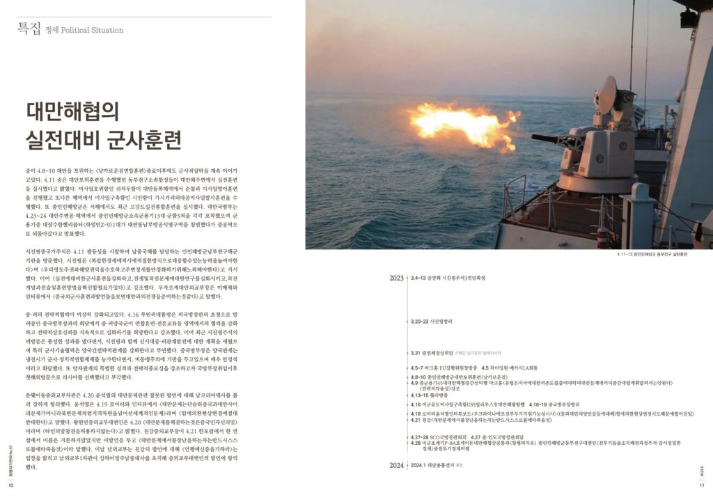 중이 4.8~10 대만을 포위하는 <날카로운검연합훈련>종료이후에도 군사적압박을 계속 이어가고있다. 4.11 중은 대만포위훈련을 수행했던 동부전구소속함정들이 대만해주변에서 실전훈련을 실시했다고 밝혔다. 미사일호위함인 쉬저우함이 대만동쪽해역에서 순찰과 미사일방어훈련을 진행했고 또다른 해역에서 미사일구축함인 시안함이 가시거리외대공미사일발사훈련을 수행했다. 또 중인민해방군은 서해에서도 최근 고강도실전종합훈련을 실시했다. 대만국방부는 4.23~24 대만주변공·해역에서 중인민해방군소속군용기13대·군함3척을 각각 포착했으며 군용기중 대잠수함헬리콥터<하얼빈Z-9>1대가 대만동남부방공식별구역을 침범했다가 중공역으로 되돌아갔다고 발표했다.
