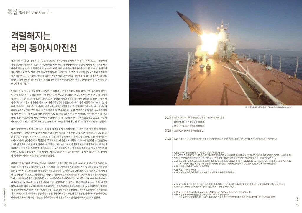 최근 러와 미·일·남 양측의 군사훈련이 같은날 동해상에서 동시에 이뤄졌다. 북의 ICBM시험발사와 미·남합동군사연습직후 4.14 러극동지역을 방어하는 러태평양함대는 푸틴의 명령에 따라 비상전투태세에 돌입했고 4.17 동해상에서 실사격훈련을 포함한 대규모해상훈련을 전개했다. 이날 동해상에서는 한편으로 미·일·남의 북핵·미사일방어훈련이 진행됐다. 이기간 대규모미사일공습격퇴·잠수함탐지·파괴훈련등을 실시했다. 일과의 영유권분쟁지역인 남쿠릴열도·사할린주에서는 적상륙격퇴훈련도 벌였다. 러태평양함대는 3월부터 동해상에서 순항미사일발사훈련·적잠수함격퇴훈련등 수차례의 군사훈련을 실시했다.