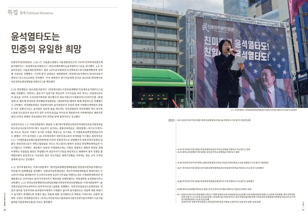 민중민주당은 4.3 미대사관앞에서 발표한 논평<제주항쟁정신따라친외세반민족윤석열정부를타도하고미군철거하자!>에서 오늘까지 실시되는 쌍룡상륙연습은 <평양점령>·<북지도부제거>를 의도로 원산과 지형이 유사한 포항을 배경으로 실시되는 미·남합동북침핵전쟁연습이라고 밝혔다. 이어 윤석열은 3.28 국무회의에서 대북인권소동의 본격화를 지시했고 통일부측은 3.31 <다양한홍보콘텐츠를제작할예정>이라며 반통일적으로 망발했다며 대북적대시정책의 일환인 대북인권소동이 대북고립압살을 의도로 하고있다는점에서 본질상 북침핵전쟁연습과 다르지않다고 지적했다. 계속해서 78년전 미제침략군대는 이땅을 점령하고 해방과 통일을 위해 투쟁하는 민중들을 총칼로 학살했으며 민중자치기구들을 폭압적으로 해체하며 결국 전쟁을 불러왔다면서 본질적으로 75년전과 결코 다르지않은 현위기상황을 극복하는 힘은 오직 우리민중에게 있다고 강조했다.