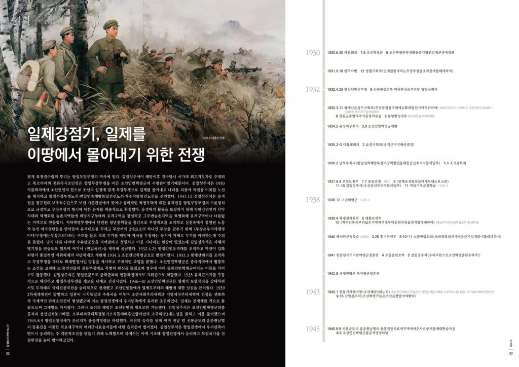 현재 북정권수립의 뿌리는 항일무장투쟁의 역사에 있다. 김일성주석이 해방이후 건국당시 국가의 최고지도자로 추대되고 북코리아의 공화국시조인것은 항일무장투쟁을 이끈 조선인민혁명군의 사령관이었기때문이다. 김일성주석은 1930 카륜회의에서 조선인민의 힘으로 조선의 실정에 맞게 무장투쟁으로 일제를 몰아내고 나라를 되찾아 독립을 이룩할 노선을 제시하고 항일무장투쟁노선·반일민족해방통일전선노선·자주적당창건노선을 선언했다. 1931.12 김일성주석은 유격전을 정규전의 보조적수단으로 보던 기존관념에서 벗어나 상비적인 혁명무력에 의한 유격전을 항일무장투쟁의 기본형식으로 규정하고 무장투쟁의 형식에 대한 문제를 최종적으로 확정했다. 유격대의 활동을 보장하기 위해 두만강연안의 산악지대와 혁명화된 농촌지역들에 해방지구형태의 유격구역을 창설하고 그주변농촌지역을 혁명화해 유격구역이나 다름없는 지역으로 만들었다. 지하혁명투쟁에서 단련된 청년전위들을 골간으로 무장대오를 조직하고 실천속에서 검열된 노동자·농민·애국청년들을 받아들여 유격대오를 꾸리고 무장력의 2대요소의 하나인 무장을 갖추기 위해 <무장은우리의생명이다!무장에는무장으로!>라는 구호를 들고 적의 무기를 빼앗아 자신을 무장하는 동시에 자체로 무기를 마련하는데 주의를 돌렸다. 당시 다른 나라에 수류탄공장을 지어달라고 청원하고 이를 기다리는 현상이 있었는데 김일성주석은 자체의 병기창을 만들도록 했으며 여기서 <연길폭탄>을 제작해 공급했다. 1932.4.25 반일인민유격대를 조직하고 역량이 강화되면서 통일적인 지휘체계의 사단체계로 개편해 1934.3 조선인민혁명군으로 발전시켰다. 1933.3 왕재산회의를 조직하고 무장투쟁을 국내로 확대발전시킬 방침을 제시하고 구체적인 과업을 밝혔다. 조선인민혁명군은 중국지역에서 활동하는 조건을 고려해 조·중인민들의 공동투쟁에도 특별히 관심을 돌렸으며 경우에 따라 동북인민혁명군이라는 이름을 가지고도 활동했다. 김일성주석은 항일연군으로 중국군과의 연합작전에서도 지휘관으로 역할했다. 1935 유격근거지를 주동적으로 해산하고 항일무장투쟁을 새로운 단계로 전진시켰다. 1936~40 조선인민혁명군은 일제의 토벌작전을 상대하면서도 두차례의 국내진공작전을 승리적으로 전개했고 조선인민들에게 일제로부터의 해방에 대한 신심을 안겨줬다. 1939 2차세계대전이 발발하고 일본이 나치독일과 추축국을 이루며 소련사회주의세력과 미영제국주의세력에 전쟁을 선포하자 국제적인 반파쇼전선이 형성됐으며 이는 항일전쟁에서 우리민족에게 유리한 조건이었다. 일제는 전세계를 적으로 돌림으로써 그패망을 자처했다. 그러나 조선의 해방은 조선인민의 힘으로만 가능했다. 김일성주석은 조선인민혁명군의총공격과 전인민적봉기배합, 소부대와국내무장봉기조직들의배후연합작전의 조국해방3대노선을 밝히고 이를 준비했으며 1945.8.9 항일전쟁정세가 무르익자 총공격명령을 하달했다. 작전의 승리를 위해 이미 전날 밤 선봉군토리·훈춘현남별리·동흥진을 비롯한 적요새구역의 여러군사요충지들에 대한 습격전이 벌어졌다. 김일성주석은 항일전쟁에서 우리민족이 반드시 승리하는 주·객관적조건을 만들기 위해 노력했으며 북에서는 이에 기초해 항일전쟁에서 승리하고 독립국가를 건설한것을 높이 평가하고있다.