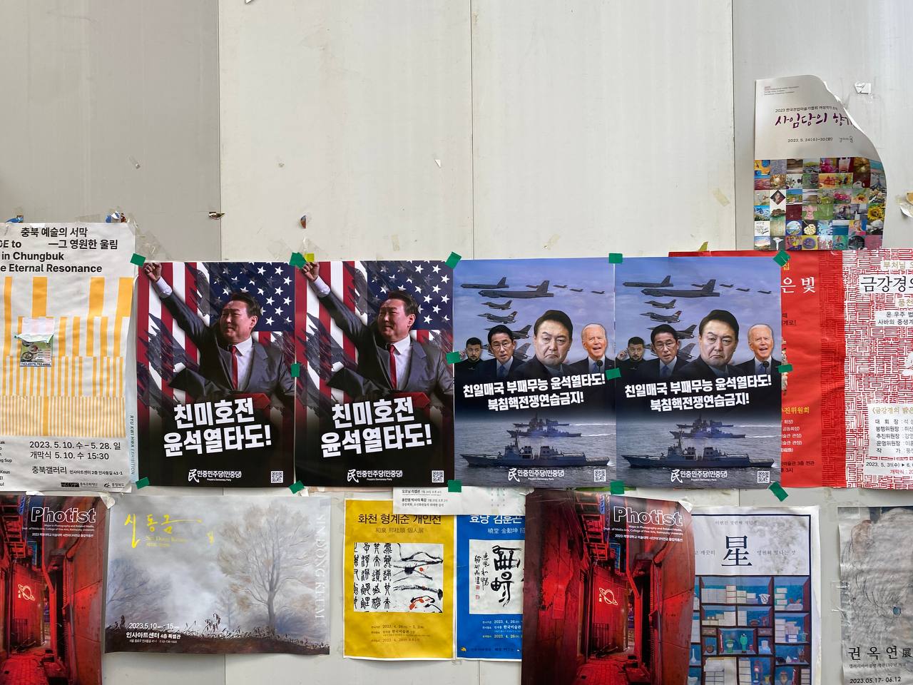 정당연설회 민중민주당 서울지역포스터부착 〈친일매국 파쇼호전 윤석열타도! 미일남3각전쟁동맹규탄!〉 2023년 5월 30일 FacebookTwitter 29일 민중민주당(민중당)은 종각역·안국역일대애서 <친일매국 파쇼호전 윤석열타도! 미일남3각전쟁동맹규탄!>, <친일매국 부패무능 윤석열타도! 북침핵전쟁연습금지!>, <친일매국 윤석열타도!>, <친미호전 윤석열타도!> 포스터를 부착했다.