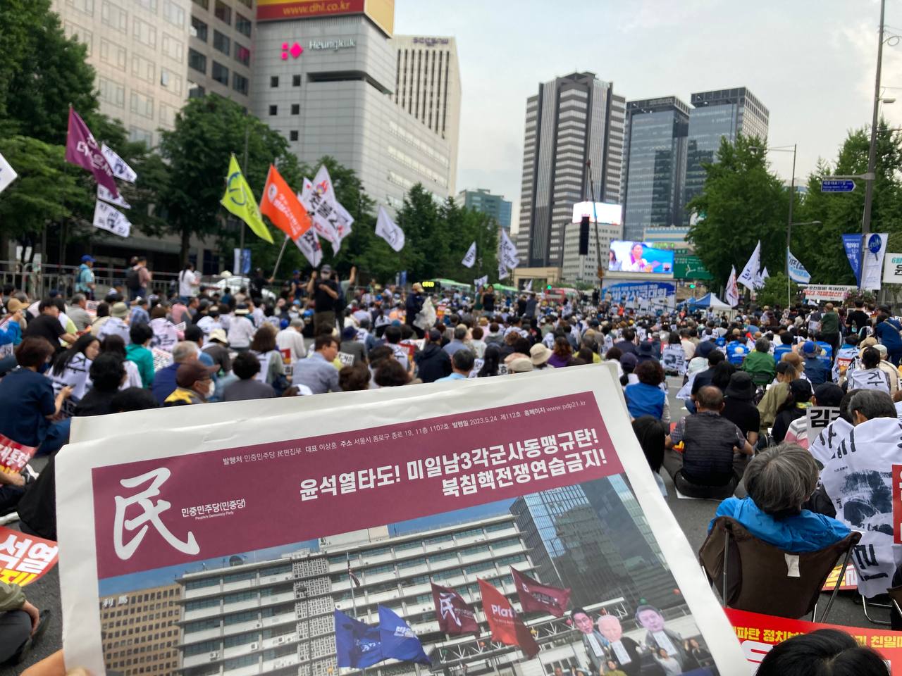 당원들은 참가자들에게 민중민주당신문 民112호 <윤석열타도! 미일남3각군사동맹규탄! 북침핵전쟁연습금지!>를 배포했다.