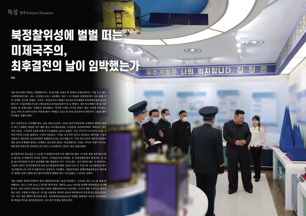 5월 히로시마G7회의는 전쟁회담이다. 북·중·러를 상대로 한 최대의 전쟁도발이다. 이를 두고 중은 <난폭한내정간섭>, 러는 <선전포고>라고 규탄했다. 북은 5.19 발표한 김명철명의의 글을 통해 가장 강력한 경고를 날렸다. 이글은 <특등친미주구젤렌스키도당은이미패했으며비참한운명을선고받았다>며 <다음차례는미국과그에추종하는나라들로될것이다>고 맺었다. 제국주의세력의 북·중·러를 상대로 한 전쟁도발은 오랫동안 계속돼왔다. 하지만 이제는 더이상 참을수 없는 지경에 이르렀다. 2022 러의 우크라이나전이 이렇게 해서 시작됐고 2023 북·중의 남코리아전·대만전이 그렇게 해서 머지않은 상황이 됐다.