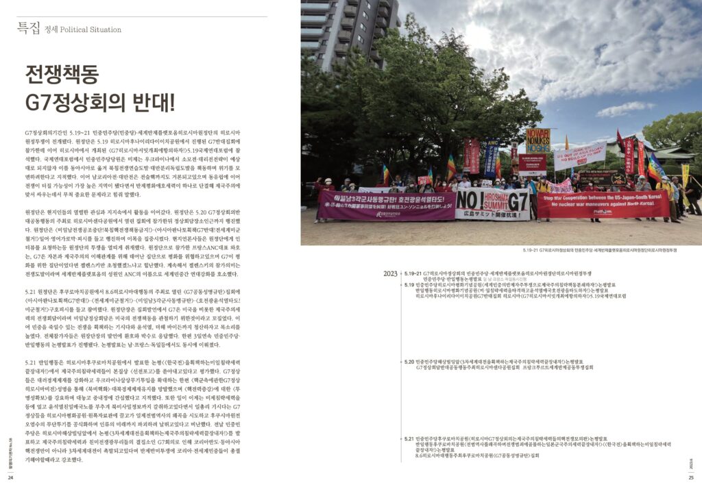 5.21 반일행동은 히로시마후쿠로마치공원에서 발표한 논평<<한국전>을획책하는미일침략세력 끝장내자!>에서 제국주의침략세력들이 본질상 <선전포고>를 쏟아내고있다고 평가했다. G7정상들은 대러경제제재를 강화하고 우크라이나살상무기투입을 확대하는 한편 <핵군축에관한G7정상히로시마비전>성명을 통해 <북비핵화>·대북경제제재유지를 망발했으며 <핵전력증강>에 대한 <투명성확보>를 강요하며 대놓고 중내정에 간섭했다고 지적했다. 또한 일이 이제는 미제침략세력을 등에 엎고 윤석열친일매국노를 부추겨 북미사일정보까지 갈취하고있다면서 일총리 기시다는 G7정상들을 히로시마평화공원·원폭자료관에 끌고가 일제전범역사의 왜곡을 시도하고 후쿠시마원전오염수의 무단투기를 공식화하며 인류의 미래까지 파괴하려 날뛰고있다고 비난했다. 전날 민중민주당은 히로시마해상빌딩앞에서 논평<3차세계대전을획책하는제국주의침략세력끝장내자!>를 발표하고 제국주의침략세력과 친미전쟁광무리들의 결집소인 G7회의로 인해 코리아반도·동아시아핵전쟁만이 아니라 3차세계대전이 촉발되고있다며 반제반미투쟁에 코리아·전세계민중들이 총궐기해야할때라고 강조했다.