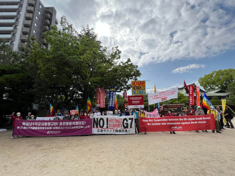 G7정상회의기간인 5.19~21 민중민주당(민중당)·세계반제플랫포옴히로시마원정단의 히로시마원정투쟁이 전개됐다. 원정단은 5.19 히로시마후나이리다이이치공원에서 진행된 G7반대집회에 참가한데 이어 히로시마에서 개최된 <G7히로시마서밋개최에항의하자!>5.19국제연대포럼에 참석했다. 국제연대포럼에서 민중민주당당원은 미제는 우크라이나에서 소모전·대리전전략이 예상대로 되지않자 이를 동아시아로 옮겨 북침전쟁연습도발·대만분리독립도발을 책동하며 위기를 모면하려한다고 지적했다. 이어 남코리아전·대만전은 전술핵까지도 거론되고있으며 동유럽에 이어 전쟁이 터질 가능성이 가장 높은 지역이 됐다면서 반제평화애호세력이 하나로 단결해 제국주의에 맞서 싸우는데서 무척 중요한 문제라고 힘줘 말했다.