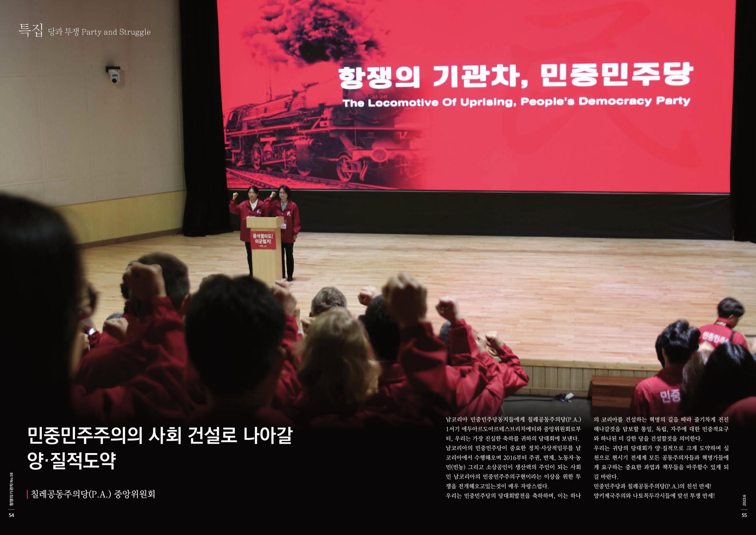 남코리아의 민중민주당이 중요한 정치·사상적임무를 남코리아에서 수행해오며 2016부터 주권, 반제, 노동자·농민(빈농) 그리고 소상공인이 생산력의 주인이 되는 사회인 남코리아의 민중민주주의구현이라는 이상을 위한 투쟁을 전개해오고있는것이 매우 자랑스럽다.