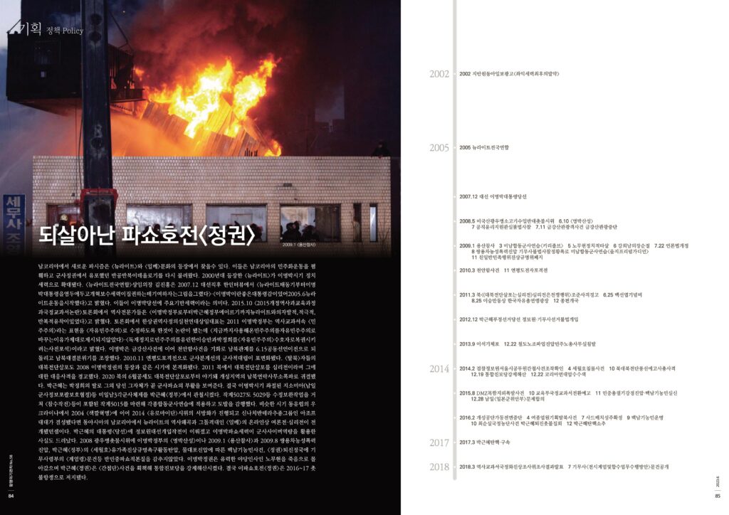 남코리아에서 새로운 파시즘은 <뉴라이트>와 <일베>문화의 등장에서 찾을수 있다. 이들은 남코리아의 민주화운동을 폄훼하고 군사정권에서 유포했던 반공반북이데올로기를 다시 불러왔다. 2000년대 등장한 <뉴라이트>가 이명박시기 정치세력으로 확대됐다. <뉴라이트전국연합>상임의장 김진홍은 2007.12 대선직후 한인터뷰에서 <뉴라이트태동기부터이명박대통령을염두에두고개혁보수세력이집권하는데기여하자는그림을그렸다>·<이명박이란좋은대통령감이있어2005.6뉴라이트운동을시작했다>고 밝혔다. 이들이 이명박당선에 주요기반세력이라는 의미다. 2015.10 <2015개정역사과교육과정과국정교과서논란>토론회에서 역사전문가들은 <이명박정부로부터박근혜정부에이르기까지뉴라이트와의자발적,적극적,반복적유착이있었다>고 밝혔다. 토론회에서 한상권역사정의실천연대상임대표는 2011 이명박정부는 역사교과서속 <민주주의>라는 표현을 <자유민주주의>로 수정하도록 한것이 논란이 됐는데 <지금까지사용해온민주주의를자유민주주의로바꾸는이유가제대로제시되지않았다>·<독재정치로민주주의를유린한이승만과박정희를<자유민주주의>수호자로복권시키려는사전포석>이라고 밝혔다. 이명박은 금강산사건에 이어 천안함사건을 기화로 남북관계를 6.15공동선언이전으로 되돌리고 남북대결분위기를 조장했다. 2010.11 연평도포격전으로 군사분계선의 군사적대립이 표면화됐다. <탈북>자들의 대북전단살포도 2008 이명박정권의 등장과 같은 시기에 본격화됐다. 2011 북에서 대북전단살포를 심리전이라며 그에 대한 대응사격을 경고했다. 2020 북의 6월공세도 대북전단살포로부터 야기돼 개성지역의 남북연락사무소폭파로 귀결됐다. 박근혜는 박정희의 딸로 그의 당선 그자체가 곧 군사파쇼의 부활을 보여준다. 결국 이명박시기 좌절된 지소미아(남일군사정보포괄보호협정)등 미일남3각군사체제를 박근혜<정부>에서 관철시켰다. 작계5027도 5029등 수정보완작업을 거쳐 <참수작전>등이 포함된 작계5015를 마련해 각종합동군사연습에 적용하고 도발을 감행했다. 비슷한 시기 동유럽의 우크라이나에서 2004 <색깔혁명>에 이어 2014 <유로마이단>시위의 서방화가 진행되고 신나치반데라추종그룹인 아조프대대가 결성됐다면 동아시아의 남코리아에서 뉴라이트의 역사왜곡과 그돌격대인 <일베>의 온라인상 여론전·심리전이 전개됐던셈이다. 박근혜의 대통령<당선>에 정보원대선개입작전이 이뤄졌고 이명박파쇼세력이 군사사이버역량을 활용한 사실도 드러났다. 2008 광우병촛불시위에 이명박정부의 <명박산성>이나 2009.1 <용산참사>과 2009.8 쌍용차농성폭력진압, 박근혜<정부>의 <세월호>유가족진상규명촉구활동탄압, 물대포진압에 따른 백남기농민사건, <정권>퇴진정국에 기무사령부의 <계엄령>문건등 반민중파쇼적본질을 감추지않았다. 이명박정권은 유력한 야당인사인 노무현을 죽음으로 몰아갔으며 박근혜<정권>은 <간첩단>사건을 획책해 통합진보당을 강제해산시켰다. 결국 이파쇼호전<정권>은 2016~17 촛불항쟁으로 저지됐다.